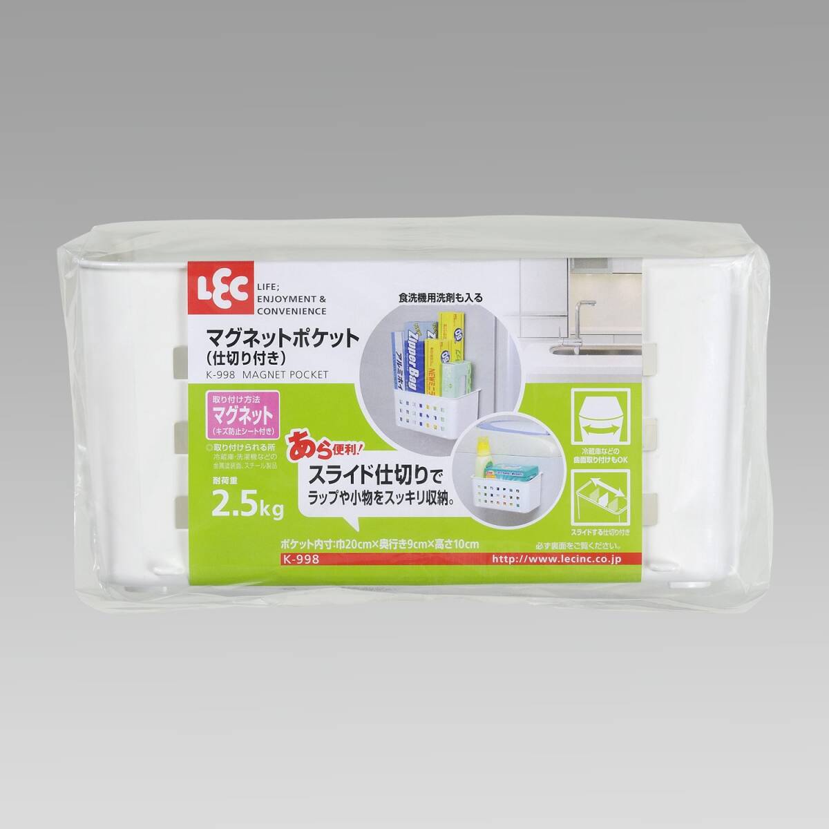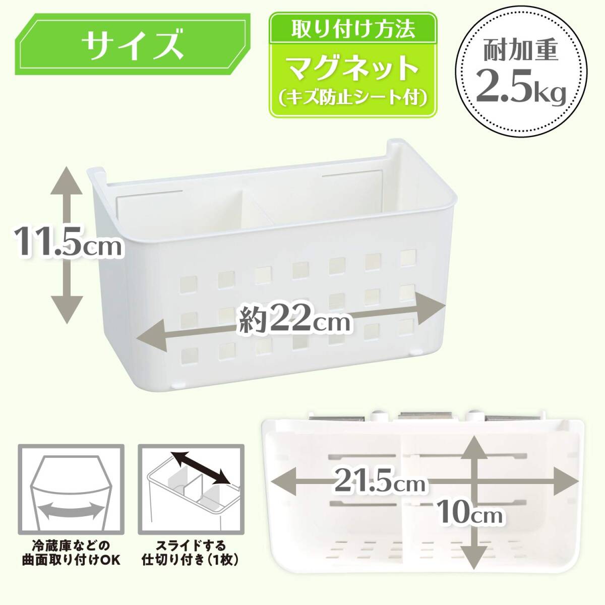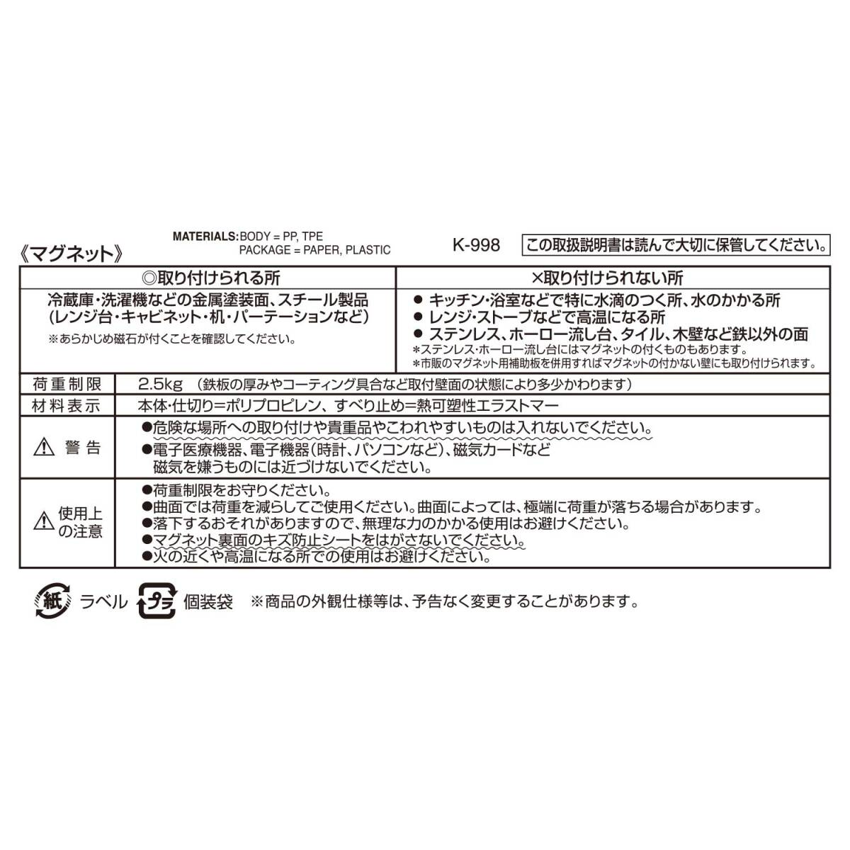 ●スライド仕切り付きでラップや小物をスッキリ収納。 ●冷蔵庫などの曲面取り付けもOK! ●マ取り付けた部分のキズ防止シート付きです。 ●洗濯機に取り付けて、洗剤入れとしても使えます。