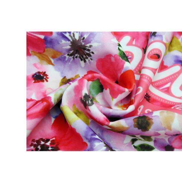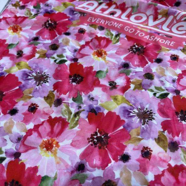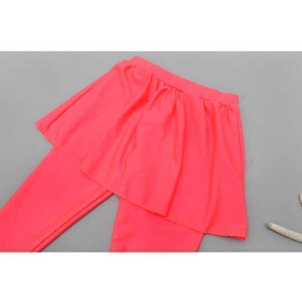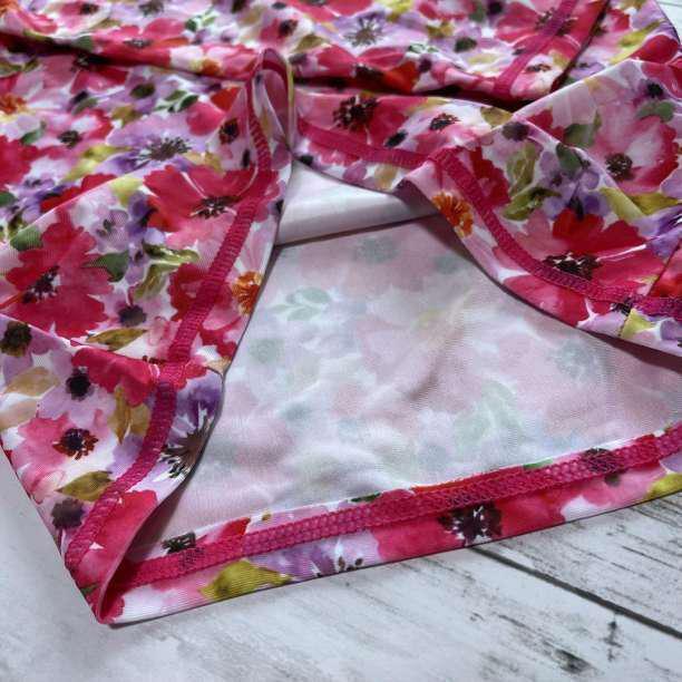 明るい花柄のトップスとショッキングサーモンピンクのレギンスが鮮やかで可愛い