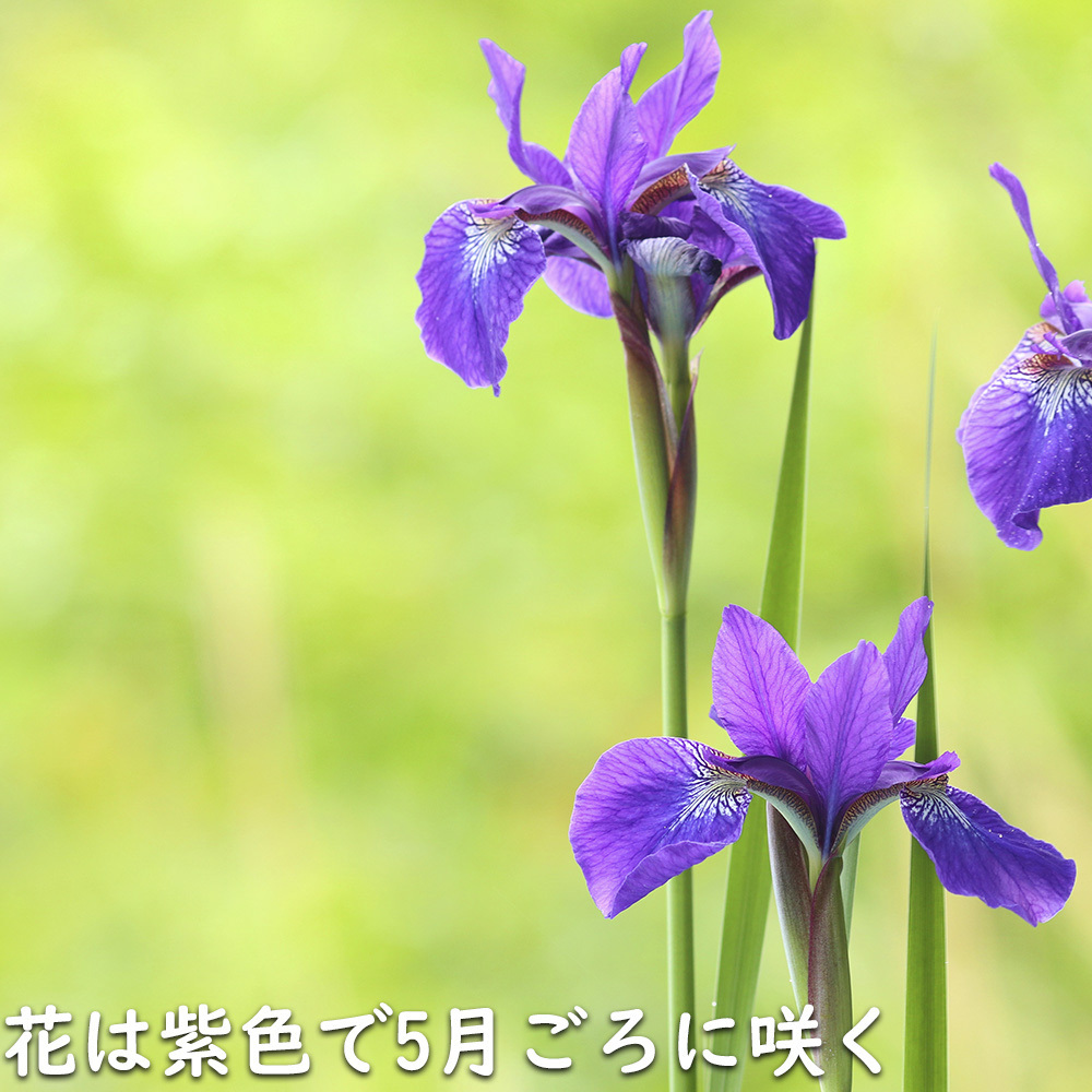 アヤメは多年草です。山林などによく生息しています。葉は明るい緑色で直立して60cm程度のびます。花は紫色で5月ごろにさきます。花と葉のコントラストが非常に美しく見栄えがします。全体に毒性があります。