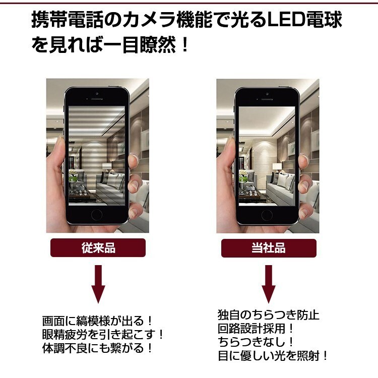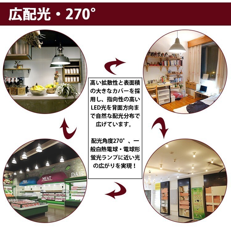 | ★オススメポイント★ 当社初の2年保証LED電球!高演色、広配光です。 物をキレイに見せる高演色Ra95 太陽光に非常に近い高演色性Ra95で、物の色を自然に再現。 ※演色性とは、照明で物体を照らすときに、自然光が当たったときの色をどの程度再現しているかを示す指標です。 Ra100は、自然光が当たったときと同様の色を再現していることを意味します。 一般家庭ではRa80以上の照明器具を使うことが推奨されています。 当社のLED電球は演色指数Ra95。自然光に近い雰囲気を演出します。 独自のちらつき防止回路設計採用!ちらつきなし! 当社の最新型LED電球には、目の疲れを軽減するちらつき防止加工を施しています!目への負担を軽くしました。 拡散カバーの採用により、LED電球特有のまぶしさ感を軽減し、優しい光を実現! 膨らんだ球形状の乳白色マルチ拡散グローブを採用することにより、LED電球特有のまぶしさを低減し、優しい光を実現しました。 広配光約270°! 高い拡散性と表面積の大きなカバーを採用し、指向性の高いLED光を背面方向まで自然な配光分布で広げています。配光角度270°、一般白熱電球・電球形蛍光ランプに近い光の広がりを実現! 発光色は、読書にも最適な【昼白色】と柔らかな光の【電球色】。 雰囲気などに合わせて2種類の色からお選びいただけます。 昼白色:すっきりとした爽やかな色味。電球色:温かみのある色味。 安心・安全 万が一の時にも割れにくい樹脂カバーを採用。高いところから落ちても破片が出にくい。軽くて丈夫な仕様で安心・安全にご利用頂けます。 省エネ・長寿命 従来の白熱電球に比べ、消費電力を約85%カットし、電気代を大幅に節約! また、LED電球の設計寿命は約40,000時間で、従来の白熱電球の約40倍です。交換の手間が省けます、取替が面倒な高所への設置もおすすめです。 様々な場所・用途でご使用いただけます。 (1)ご家庭用: リビング・ダイニング・キッチン・脱衣所・玄関・洗面所などの照明に最適です。 (2)店舗・施設用: 店舗・事業所・教室・ショッピングセンター・施設などで最も多く使用されています。 |