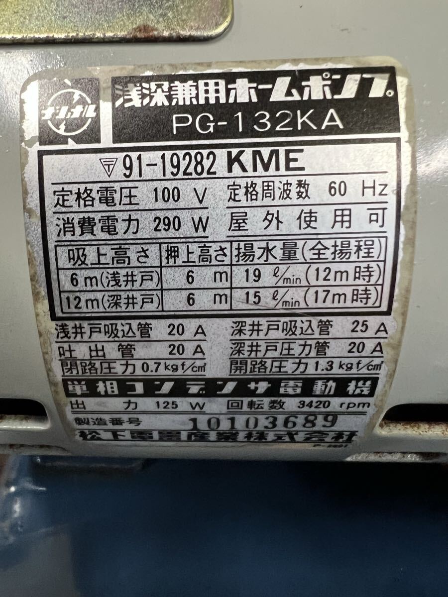 【10】16 浅深兼用ホームポンプ 松下電器 ナショナル PG-132KA 浅深兼用 浅井戸 深井戸 井戸ポンプ 動作未確認 現状品 ジャンク