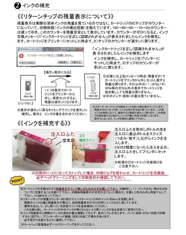 | 商品説明 | ■スターターカートリッジのICチップは自動的に残量が満タンに戻る、リターンチップを採用しているため、残量表示が戻り再生が可能になりました(リセッター不要)。 ■インク補充口が付いているのでボトルから注ぐだけで簡単に詰め替えできます!インクは純正同様全色顔料採用。 ■印刷の大幅コスト削減可能です。 ※当製品IC69詰め替えインク対応の顔料インクを必ずご使用ください。 ※染料チェンジャーシリーズの染料インクを混ぜないでください。 ■スターターカトリッジ ブラック(BK:黒)(顔料) シアン(C:青)(顔料) マゼンタ(M:赤)(顔料) イエロー(Y:黄)(顔料)内容量各10ml ■補充インク/付属 顔料インク(30ml)×4本/手袋(1組)/取扱説明書 ■対応カートリッジ名 ICBK69/ICC69/ICM69/ICY69/IC4CL69 ■対応プリンター PX-535F/PX-505F/PX-437A/PX-436A/PX-435A/PX-405A/PX-047A/PX-046A/PX-045A/PX-105 |