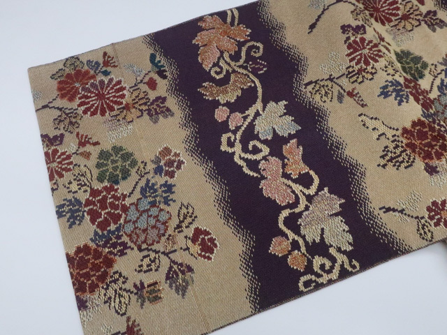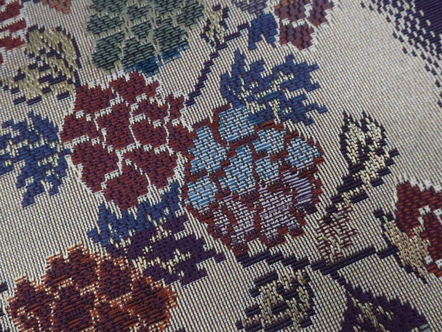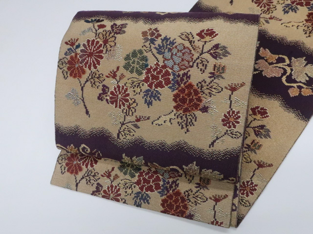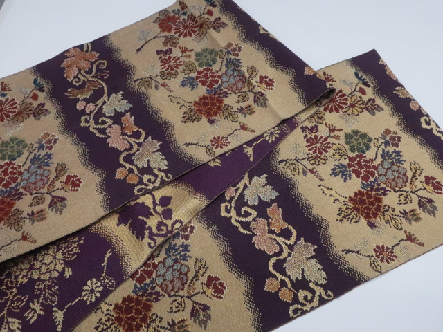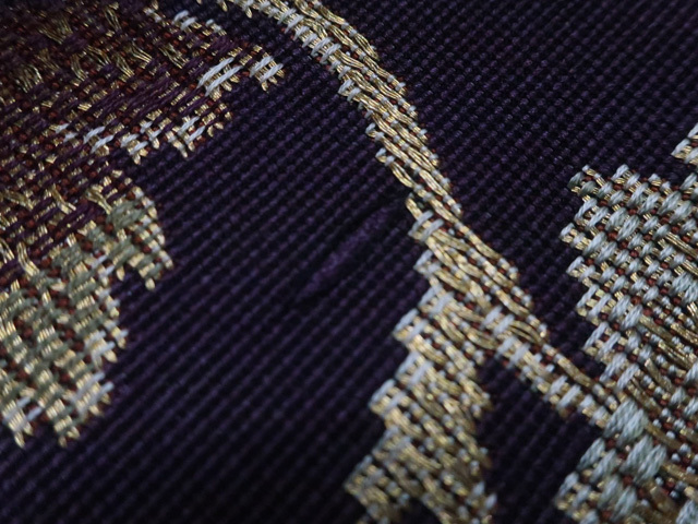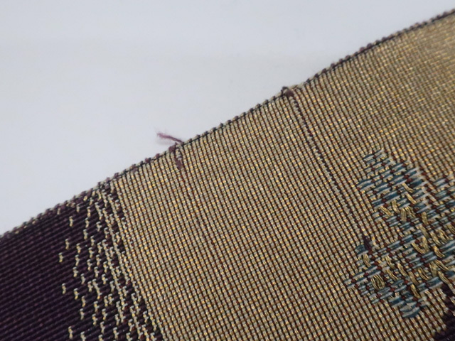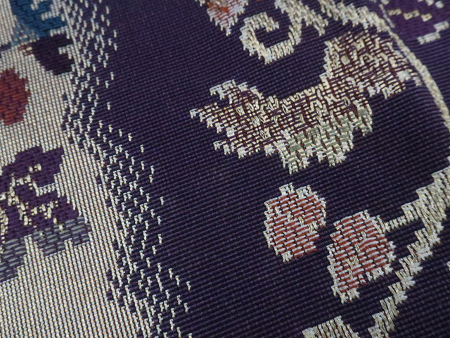リサイクル商品の為、お太鼓辺り、折れ山に薄汚れ、前柄辺りやそのほか所々に糸飛び出しがございます。 地色は紫です。 1枚目の画像が近いお色かと思われます。 素材は正絹です。 |