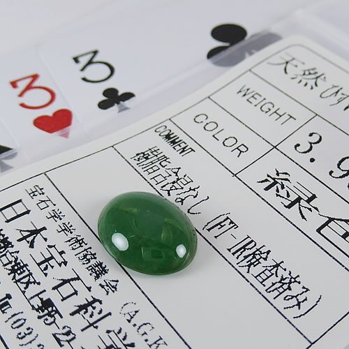 | 品名 /【SJ】新品 ヒスイ(ジェイダイト)3.95ct ジュエリールース 材質 / 天然ヒスイ(ジェイダイト) 縦・横 / (約)12.6mm 10mm 厚さ / (約)3.8mm 総重量 / 3.95ct 日宝協ソーティング付き 【SJ】/ 新品製品 品番 / ACD545 参考小売価格 / 385,000円 |