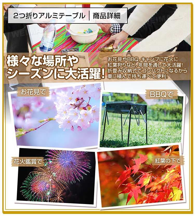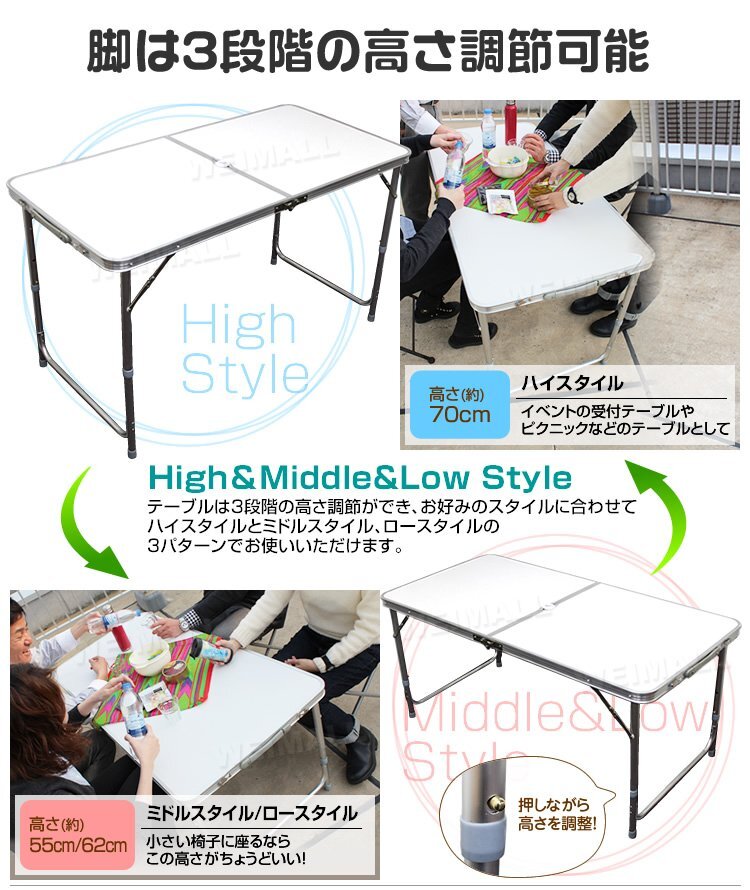 車のトランクに入れる時や持ち運びの際にもとても便利な取っ手付きで持ち運びもラクラク!! サビに強いアルミを使用。 天板には防水加工が施されています。 テーブルは、3段階の高さ調節ができ、お好みのスタイルに合わせて「ハイスタイル」「ロースタイル」の2パターンでお使いいただけます。 天板中心部にはパラソル用ホールがあるので、ベランダやテラスでの使用にもおススメです。 キャンプ、バーベキュー、お花見などにとても便利。 気軽にアウトドアレジャーをお楽しみいただけます!! 【商品仕様】 テーブルサイズ(約): ・幅120cm×奥行60cm×高さ55cm/62cm/70cm ※高さ3段階調節 ・収納サイズ(約):幅62cm×奥行6.5cm×高さ62cm ・カラー:ベージュ(バンブー) ・パラソル用ホール直径サイズ(約):26mm ・材質:アルミ、MDF(耐熱・耐水加工)、ポリエステル、スチール ・重量(約):4.7kg |