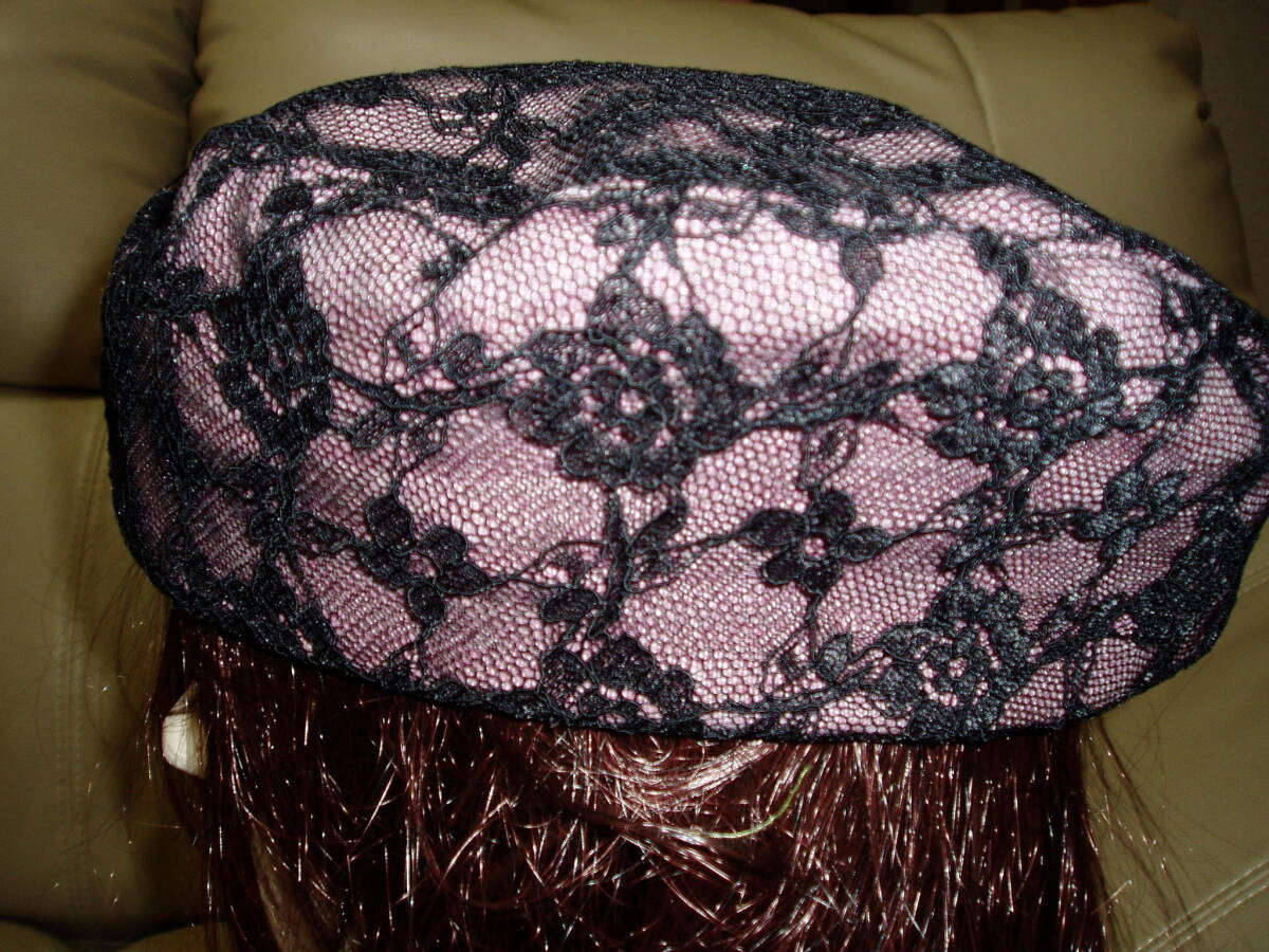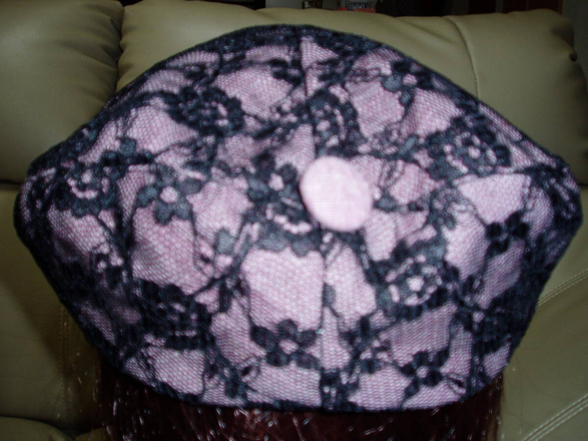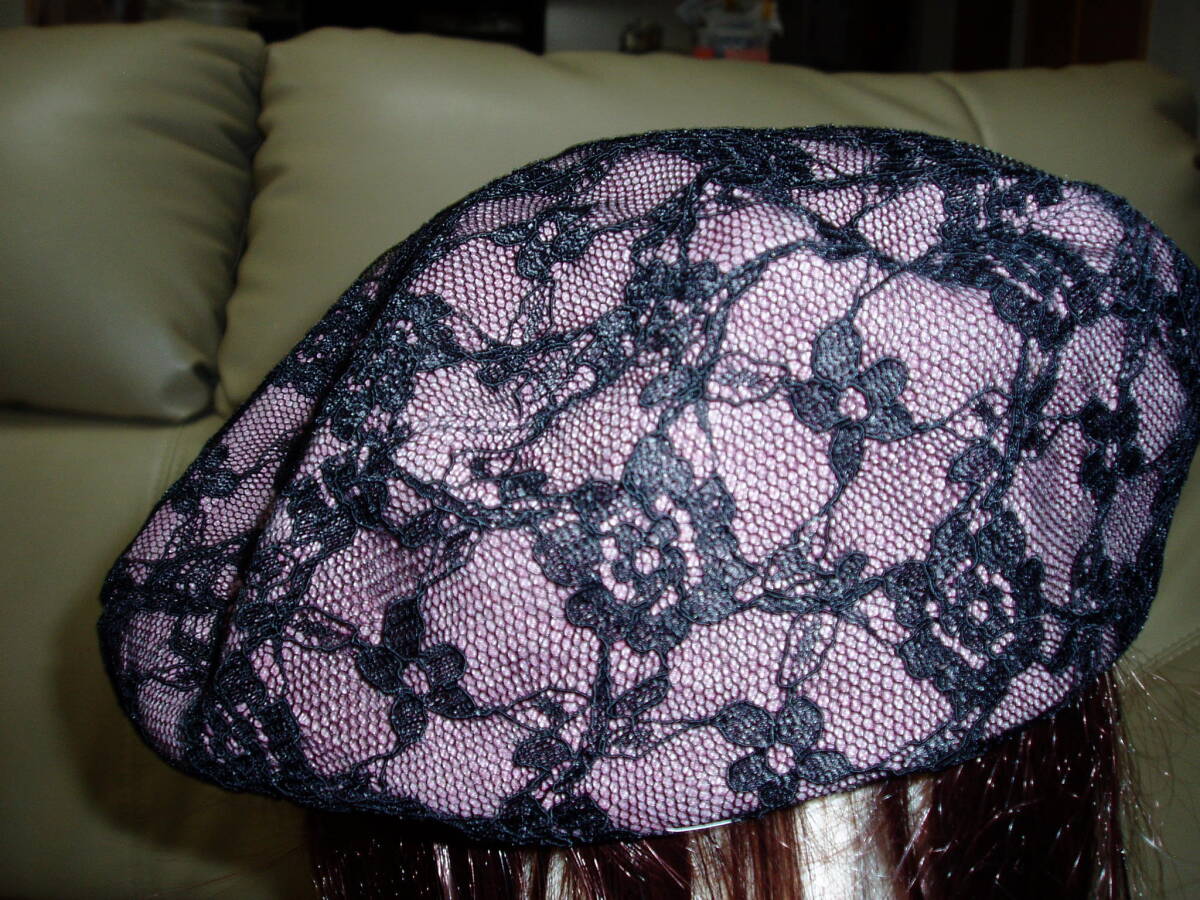 シックなピンクに 黒チュールレースがはなやかな、手製ベレー帽です。