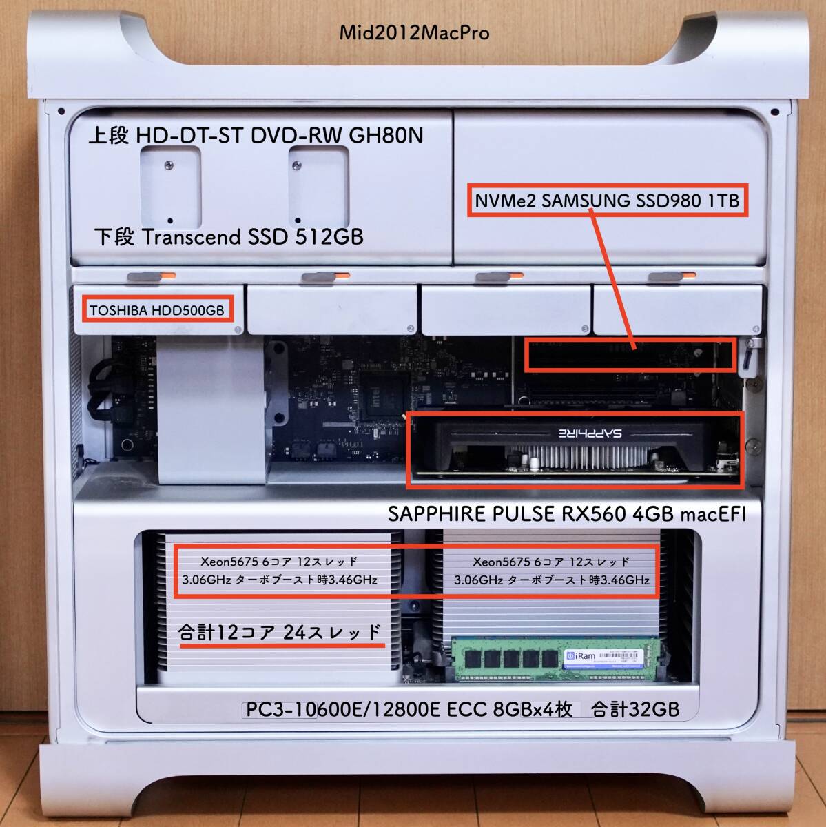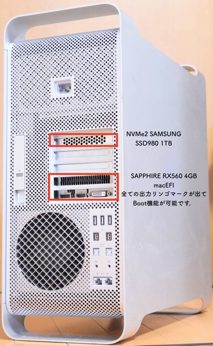 2025年! 爆速チューニング仕様!最新macOS Sequoia15.7.2/旧macOS Mojave10.14.6 CTO Mid2012MacPro 12コア 24スレッド3.06GHz x2<ターボブースト3.46GHz>SAPPHIRE PULSE RX560 4GB macEFI 4K@60Hz出力Boot機能対応・Metal対応/M.2 NVMe 1TB+SSD512GB+HDD500GB
