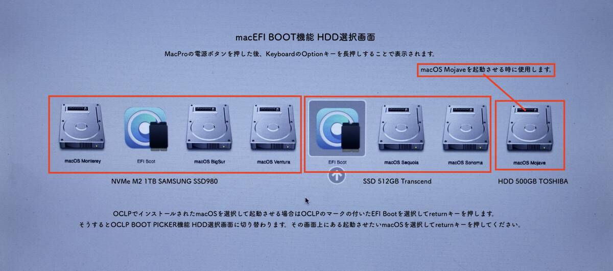 Boot機能とは、起動後にoptionキーを長押しすることでハードディスクやインストールディスクの選択ができる画面が表示されて好きなOSを選択して起動できる機能です。この機能がないと新規でmacOSをインストールすることやアップデートすることもできないのでMacProには重要な機能と言えるでしょう。