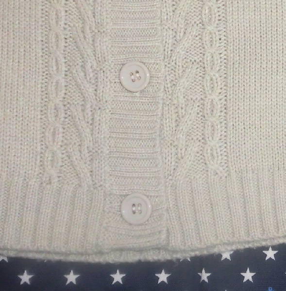 | 数回使用しましたので、薄く毛玉のような、毛羽立ちのようなものがあります。 裏側は毛玉が多いです。 それ以外は比較的キレイです。 ケーブル編みのぽこぽこ感がメリハリ効果で、すっきり見せにひと役! どう着てもさまになるありがたさ。 一枚で2倍着まわせる! 2-WAYで両面使えて超オトク!冬は重ね着、春先は一枚でと、長く着られます。 ベーシックカラーで合わせやすく、絶妙な着丈で、コーデバランスもgood! ☆ リブ イン コンフォート 後ろ前OK!ケーブル編み半袖カーディガンの会 ☆ 定価 2,900円(税込) ☆ サイズはL、バスト86~94センチ、身長154~162センチ ☆ 色は生成り ☆ 実寸は、身丈54センチ、脇下の幅45センチ、裾幅51センチ ☆ アクリル85%、毛15% ☆ 予備のボタン1つあり ☆ プルオーバーとカーディガンの2ウェイ LIVE IN COMFORT | ||