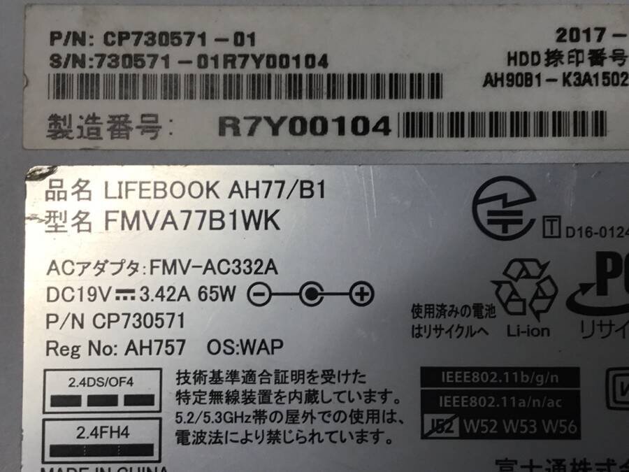 FUJITSU FMVA77B1WK LIFEBOOK AH77/B1 Core i7 7700HQ 2.80GHz 8GB 480GB(SSD)■一部保証品