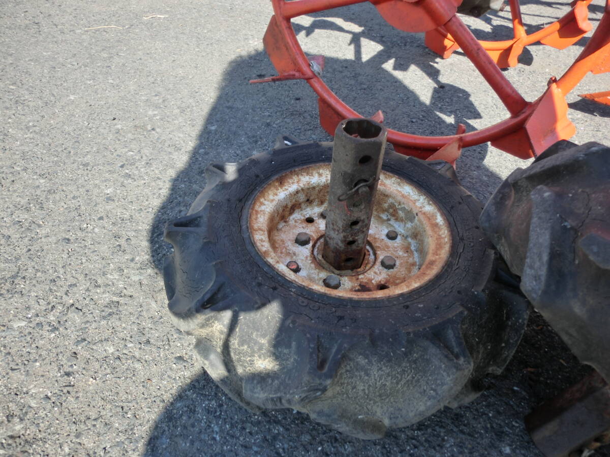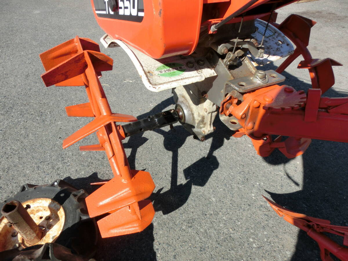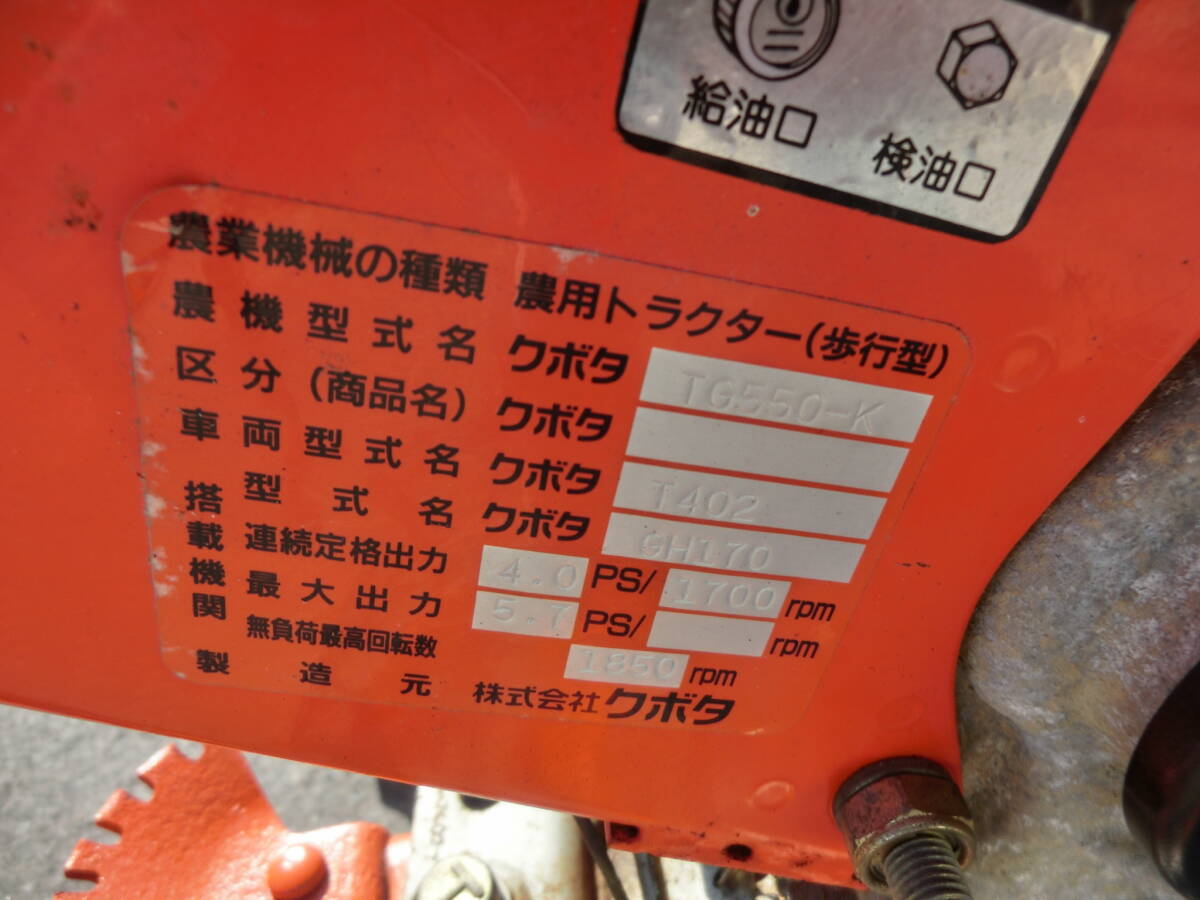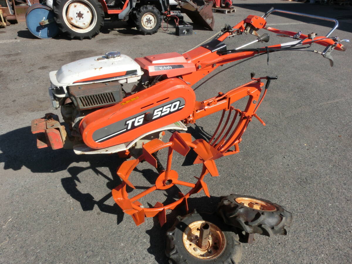 | 仕様等 | 品名:耕運機 メーカー:クボタ 型番:TG550 付属品:ゴムタイヤ 馬力:5Ps サイズ:全長170㎝ |