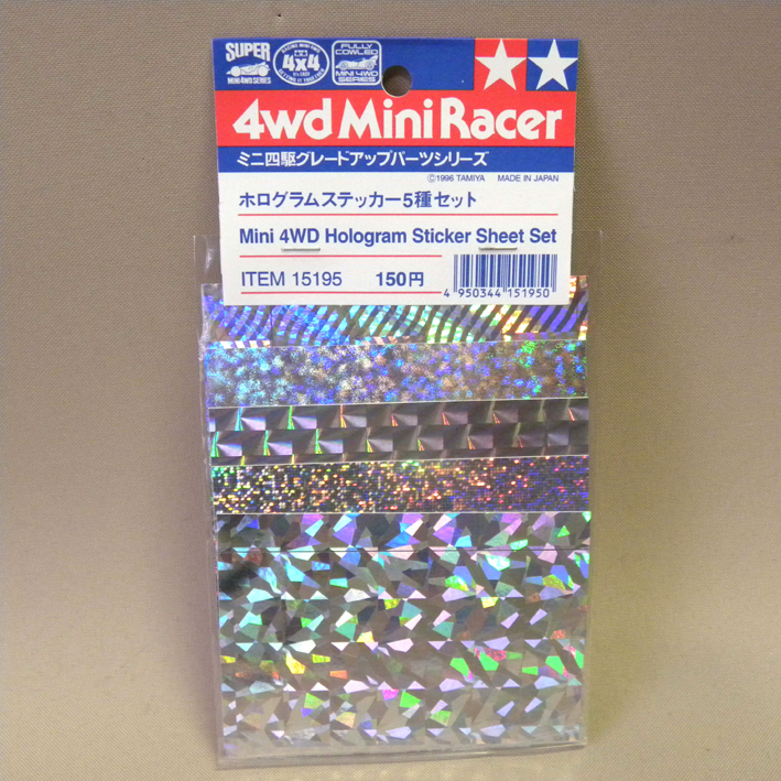 1990年代当時物、タミヤ「ミニ四駆グレードアップパーツ 15195 ホログラムステッカー5種セット」未開封新品です。