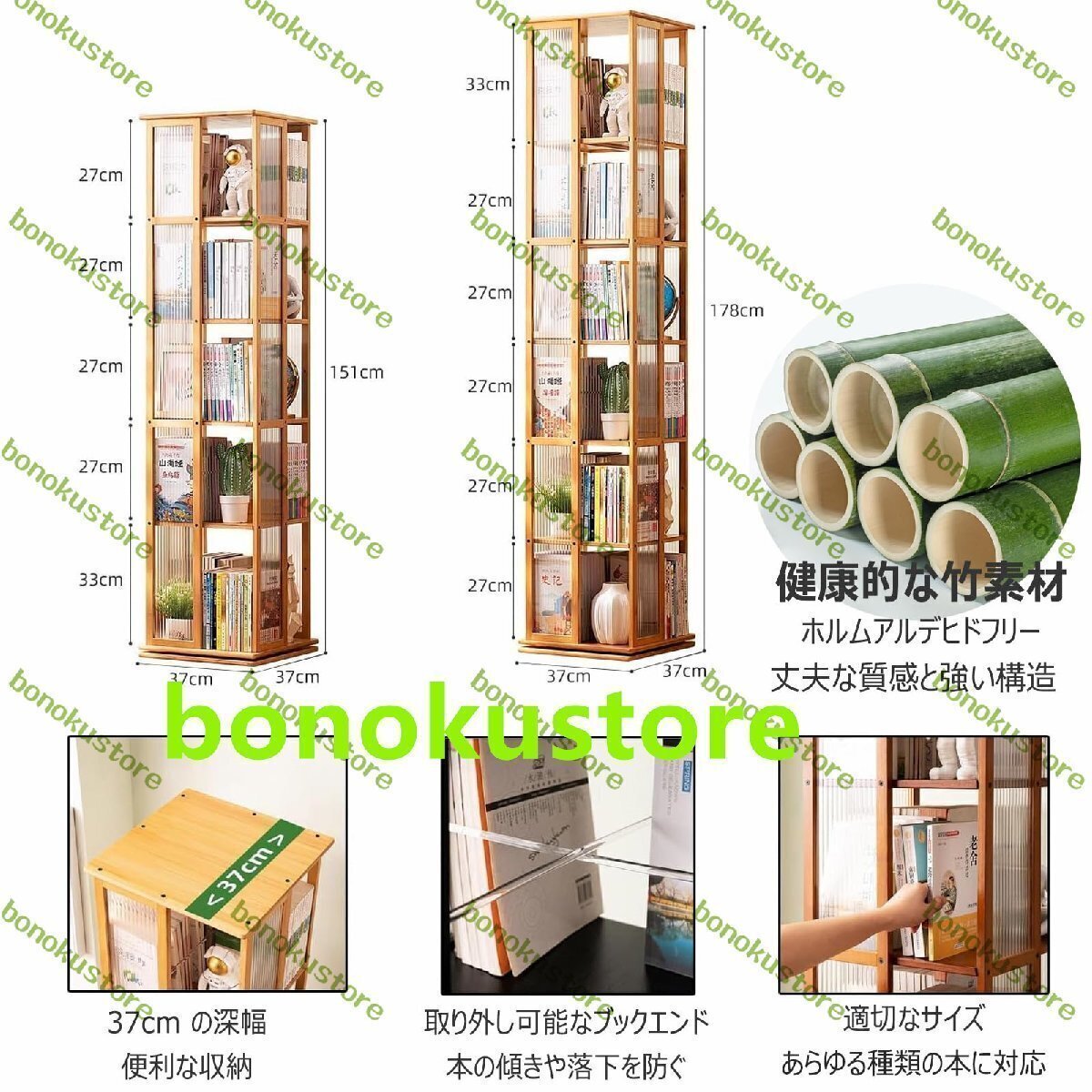 ??【製品の説明】:360° 回転する本棚は、機能性、汎用性、スタイルを兼ね備えており、整理されたスペースと、本や備品への容易なアクセスを提供します。自然の美しさ、機能性、環境に配慮したデザインが調和した竹製回転本棚をご紹介します。【特徴】:?本棚は360度自由に回転します?ステンレススチール製ボールターンテーブル?5段6段の多機能本棚はどんなアイテムも飾れます?エレガントな外観で、あらゆる装飾スタイルに合います?4面アクリル素材で作られています?本が落ちるのを防ぐ取り外し可能なブックストリップ【仕様】:製品名: 360°回転本棚素材: 竹サイズ: 5段/37*37*151CM 6段/37*37*178CM特徴: 健康的で環境に優しい、仕切りのあるスペース、3次元回転、頑丈で耐久性があります適した場所: 書斎、寝室、リビングルーム、キッチン、子供部屋、オフィスなど【注意】:手動測定には誤差がある場合がありますので、実際の測定値を参照してください。画面の表示が異なるため、色が若干異なる場合があります。製品に問題がある場合は、まずご連絡ください。
