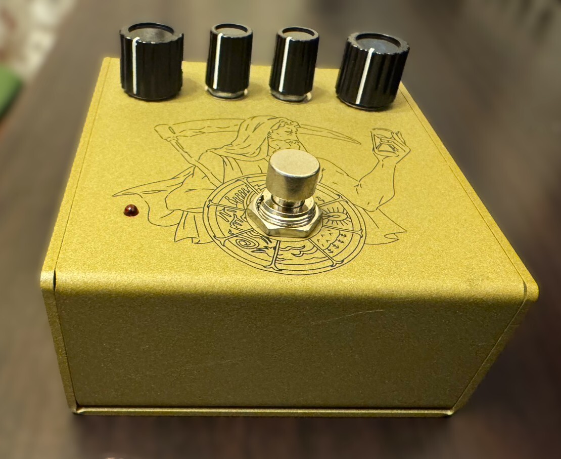 『Chronos』。古代ギリシャに伝わる「時」を司る神をモチーフとしたグラフィックが、マットゴールドの筐体に描かれております。その美しいフォルムは、ぜひ自身のエフェクターボードに加えたい、という衝動を掻き立てます。サウンドだけでなく、佇まいをも追求するOrganic Soundsならではの拘りがそこにあります。