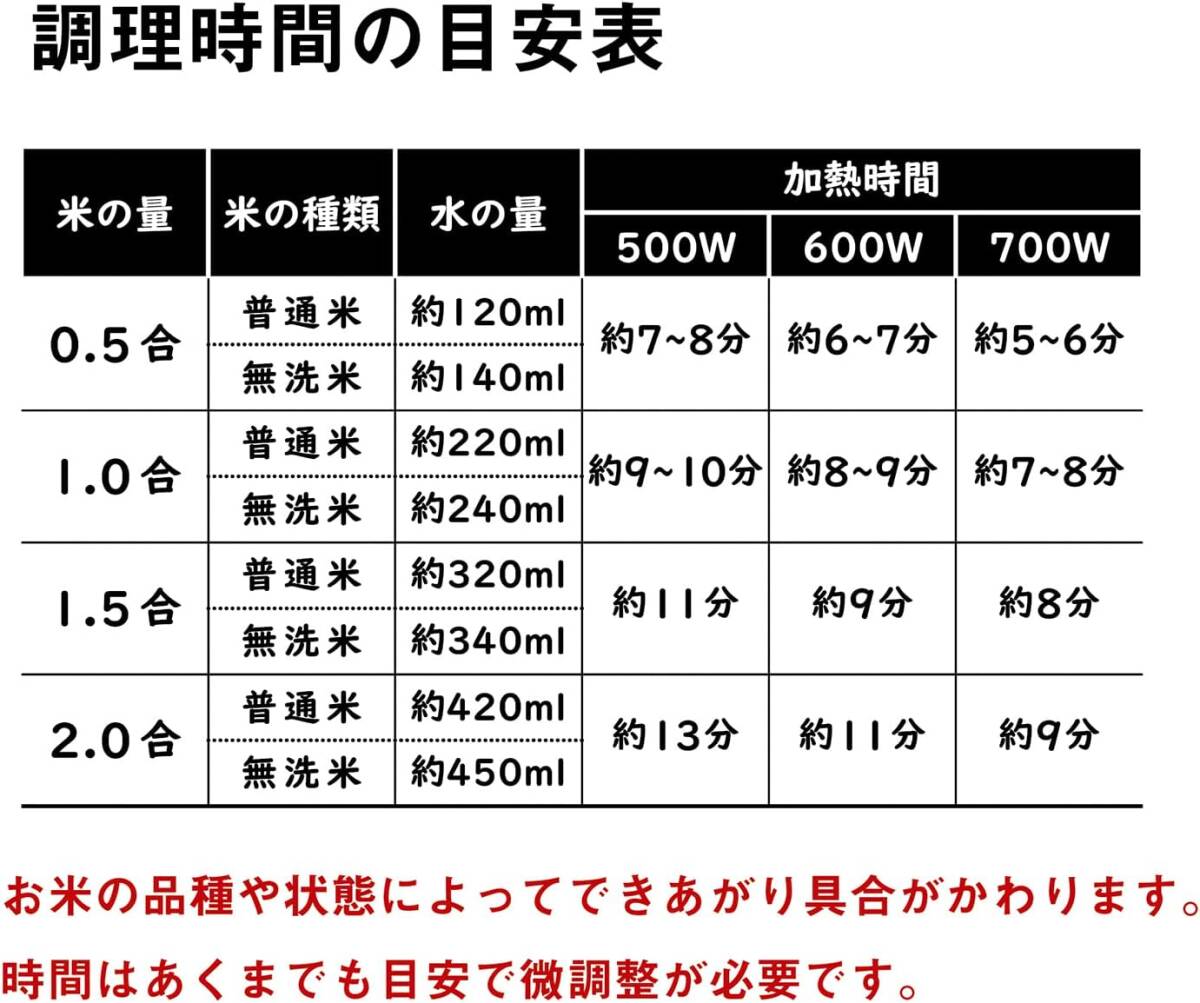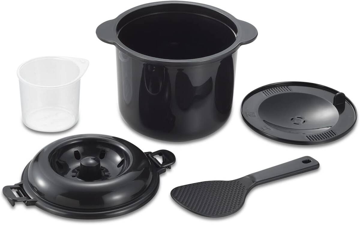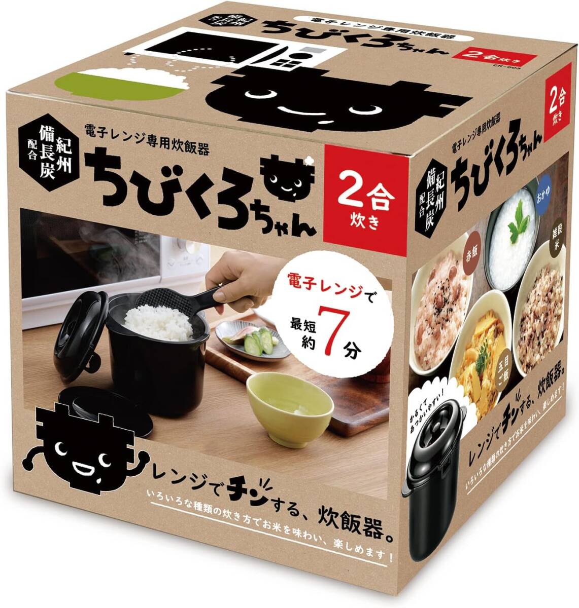 ●「電子レンジ専用炊飯器 備長炭入りちびくろちゃん 2合炊き」は、少量のごはんを素早くおいしく炊けるレンジ用炊飯器です。●ホットケーキミックスと牛乳だけで蒸しパンもできます。●0.5合から2合炊き。●計量カップ・くっつきにくいしゃもじ付き。使用方法●白米の炊き方(1)付属の計量カップでお好みの量のお米を計ります。すり切り一杯(1合)が2膳分です。(2)お米を本体中容器に入れてとぎます。(中ぶたを利用して水切りを行います)(3)お米を入れた状態でお米の量に合った水を入れ、つけておきます。(夏冬の温度差により15-30分つけておきます)水の分量:2合/約420cc、1合/約220cc、0.5合/約120cc(4)お米を平らにならし中ぶたをのせ、(中ぶたは上面を上にして)上蓋をかぶせて加熱して下さい。加熱時間:2合/約13分、1合/9-10分、0.5合/7-8分(5)加熱後、そのまま10分-15分蒸らします。その後、全体をほぐすようにかきまぜます。・水の分量、加熱時間、蒸らし時間はあくまでも目安です。お好みに合わせて調節して下さい。・電子レンジは急速に加熱しますのでお米には十分吸水させておかないと芯のあるごはんになってしまいます。お急ぎの場合には、お湯を柄って調節して下さい。・白米の場合は多少ふきこぼれすることもありますので、ご注意下さい。・表示の加熱時間は500Wの電子レンジが基準ですので、400-600Wの場合10-20%加減して加熱して下さい。・電子レンジメーカー・機種により、加熱時間が若干違いますので少しずつ加熱時間を加えてゆくのがコツです。●お手入れ方法・ご使用前に本体中容器に8分目程水を入れ、ふた・他をセットして沸騰加熱してからお使い下さい。プラスチックの臭いがとれます。・ご使用後の汚れは、食器用中性洗剤と柔らかいスポンジ等で洗って下さい。(タワシ・みがき粉・研磨材入りのスポンジ等はきずの原因になります)使用上の注意●電子レンジ専用ですので、直火・オーブレンジ・トースターには使用しないで下さい。●電子レンジ内での空炊きや水分の少ない食品の調理は避けて下さい。●加熱時は必ず炊飯器を電子レンジの中心にセットして下さい。●オーブン・グリル・トースター機能付き(複合型)の電子レンジでのご使用の場合、必ず電子レンジ機能でお使い下さい。●複合型電子電磁に「炊飯」のキーが付いている場合、そのキーは使わないで、必ず「レンジ強」のキーでお使い下さい。●油の多い食品の調理は、温度が非常に高くなる場合がありますので、避けて下さい。●調理後は別の容器に移して下さい。保存する場合は保存用の容器に移して下さい。本製品で保存はしないで下さい。●火の近くに置かないで下さい。●電子レンジから取り出す時は、必ず両手で本体外容器のフチを持って下さい。●落としたり、急激な衝撃を与えると割れる事があります。