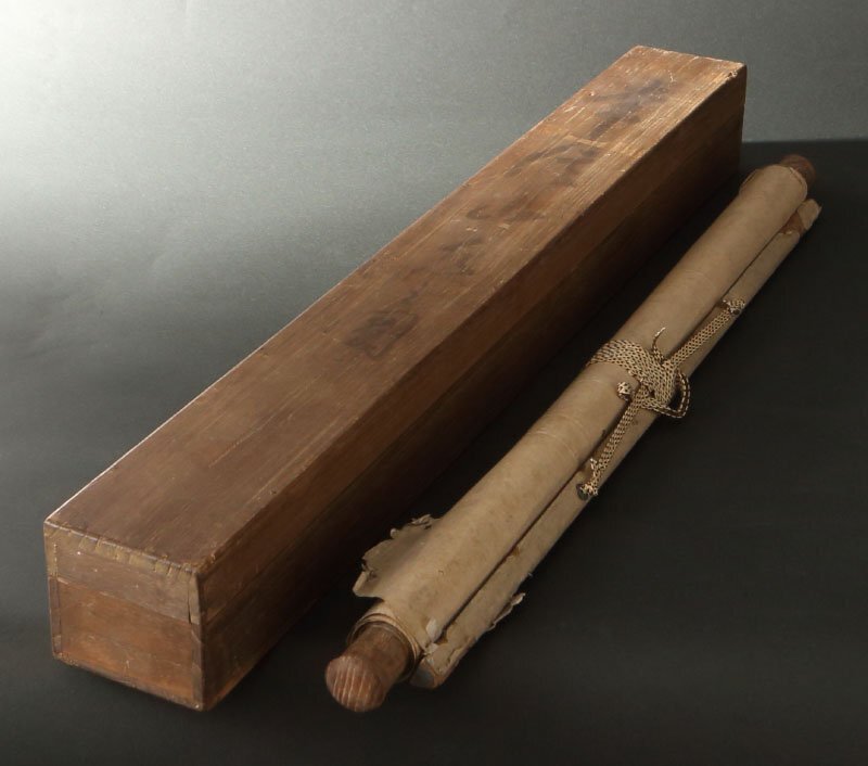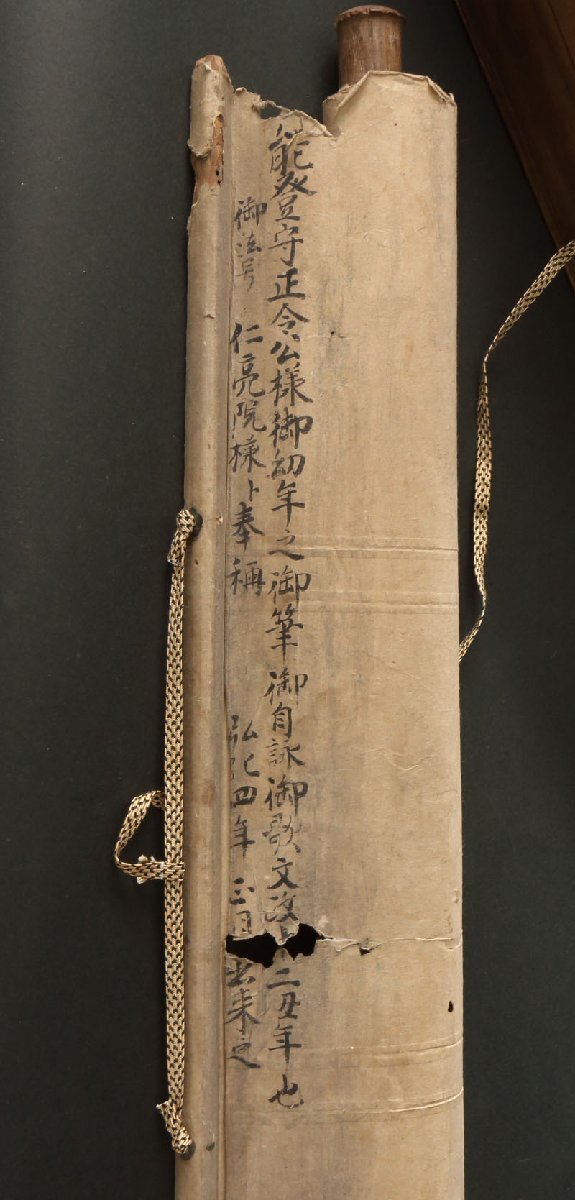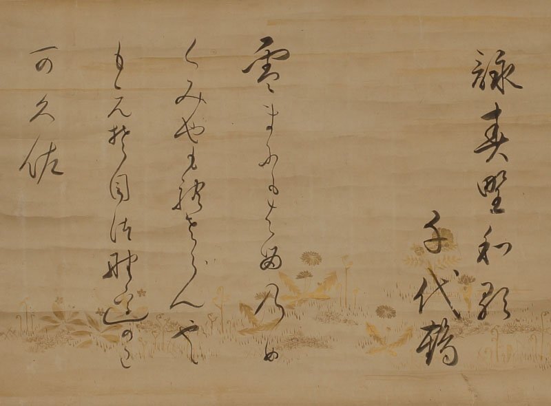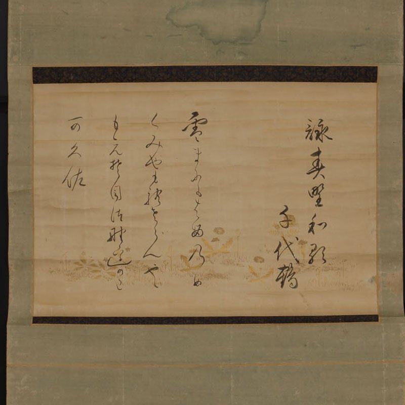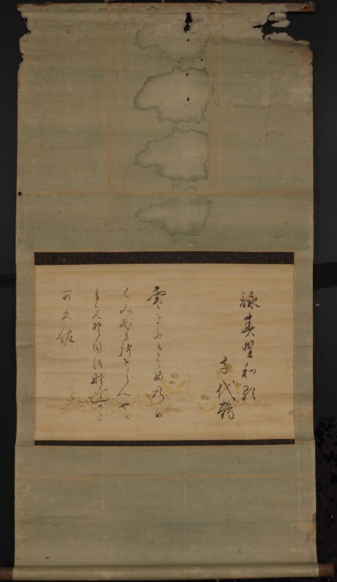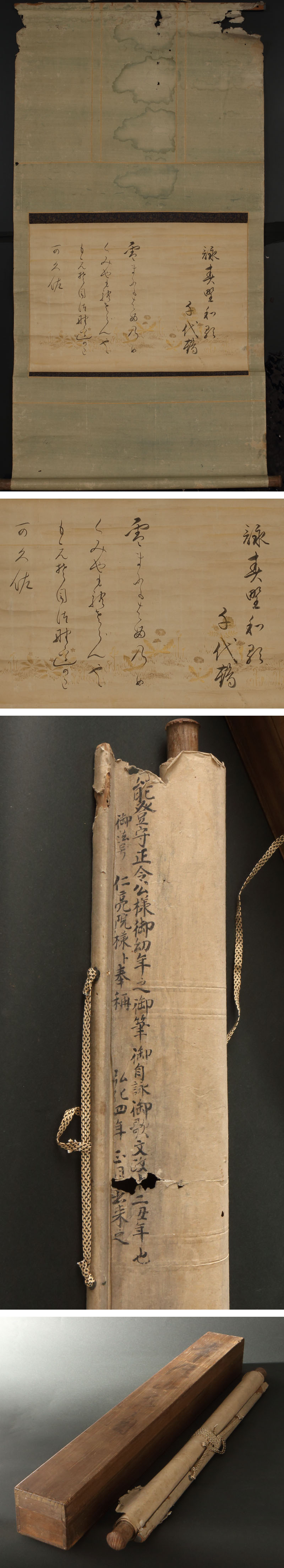 戸沢正令の和歌詠草です。 「春野」と題し、「雪まにもはるのめぐみやもれざらん やゝもえそめつ野辺のわかくさ」と詠んでおります。幼名の「千代鶴」、外題に文政12(1829)年の詠とあり、数え17歳の書と見られます。 わずか10代の書ながら、歌道の師・村田多勢子の影響を受け、大師流の書風を示しています。早熟かつ英邁な才気が感ぜられる逸品です。 ◆戸沢正令 江戸後期の大名。戸沢正胤の子。天保11(1840)年出羽新庄藩藩主戸沢家10代。人材を登用し,藩政改革をはかった。村田多勢子らに師事し,国学と和歌をよくした。天保14(1843)年没、31歳。号は風月閑人,いつのやのあるじ。名は「まさのり」ともよむ。著作に「稜威舎集」など。 付属:時代箱が付属します。 寸法:高さ107cm、幅56cm(最大幅。若干の誤差はご了承下さい) 状態:シミ・イタミ・虫食いがございます。 |
