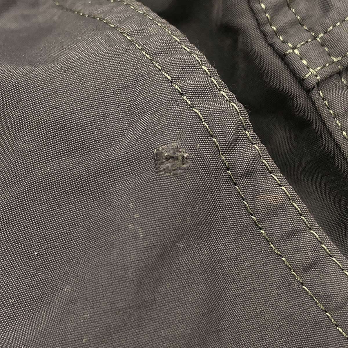 ブランドタグ・ウエスト周りにやや薄汚れ、裾口リブ部分にやや毛羽立ち、金具釦にやや錆び・小傷、左ポケットあたりに一部穴あきがございます。
