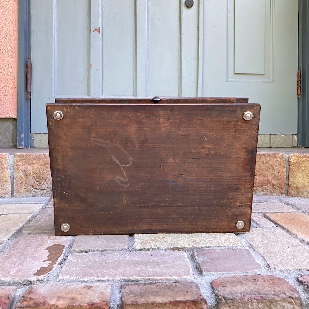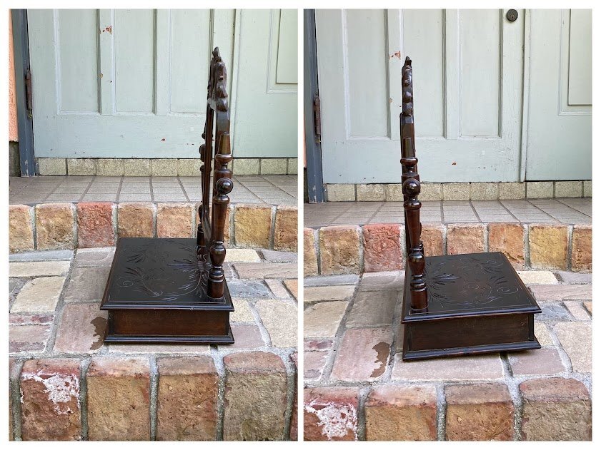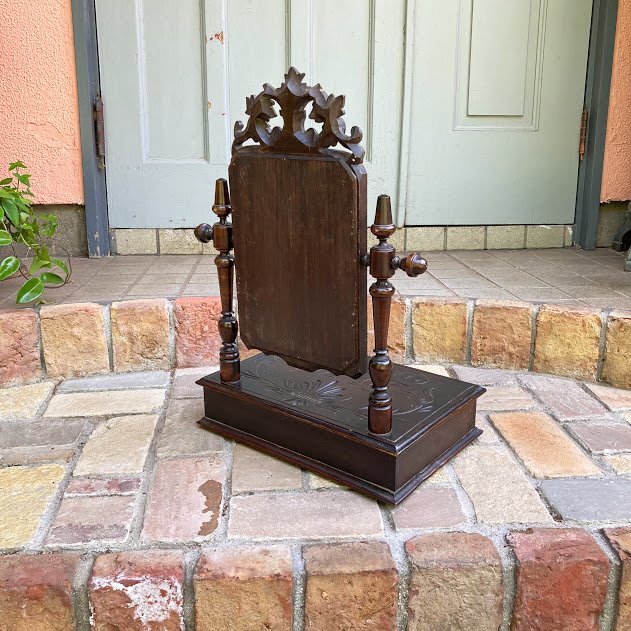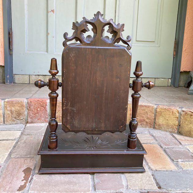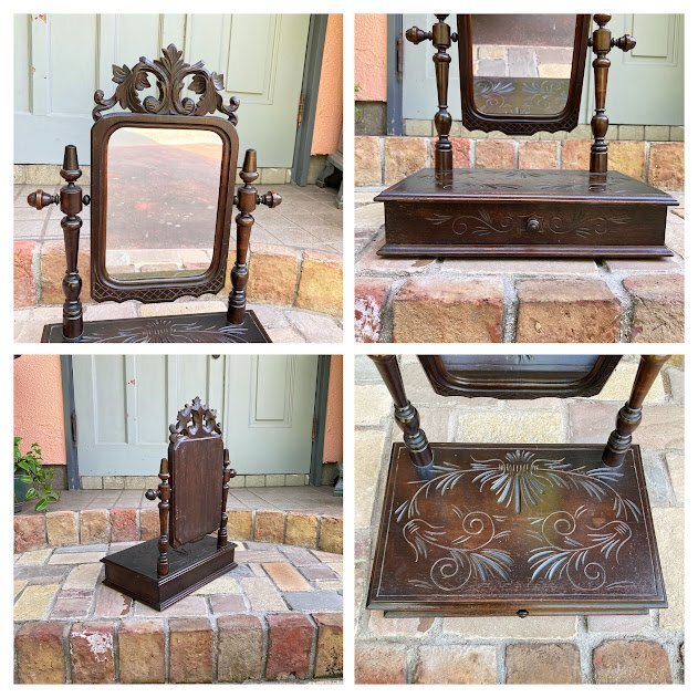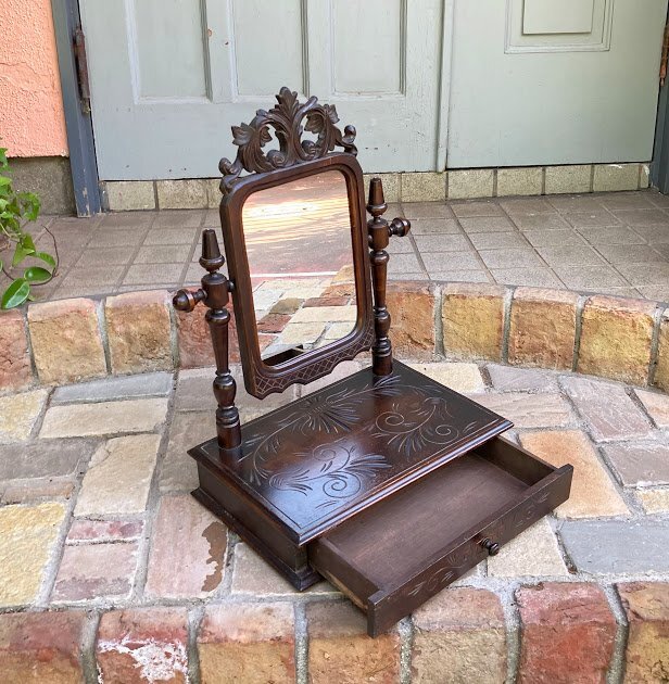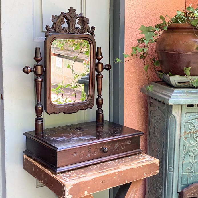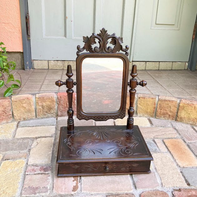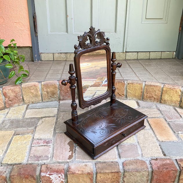 イギリスより入荷しました。くっきりとした装飾が印象的な引き出し付きの卓上ミラー。鏡のみ新品に交換してあるので、細かいチェックも安心です!鏡の部分は上下に動き、下に小さな収納が付いているので小物をスッキリと収納できます。玄関では鍵、宅配用の印鑑などを入れておいてもいいですね。上部の彫刻部分(正面向かって右側)に1か所欠けている部分があります。底には脚に代わるピンが付属していました。なお、アンティークの商品らしく小さな傷や凹凸部分がみられます。これらも含めて時代を感じる雰囲気がお好きな方におすすめ。推定1930~40年代。オーク材。ピカピカの新品をお求めの方はご遠慮ください。福岡市南区の店舗にてお渡しもできますのでお気軽にどうぞ!