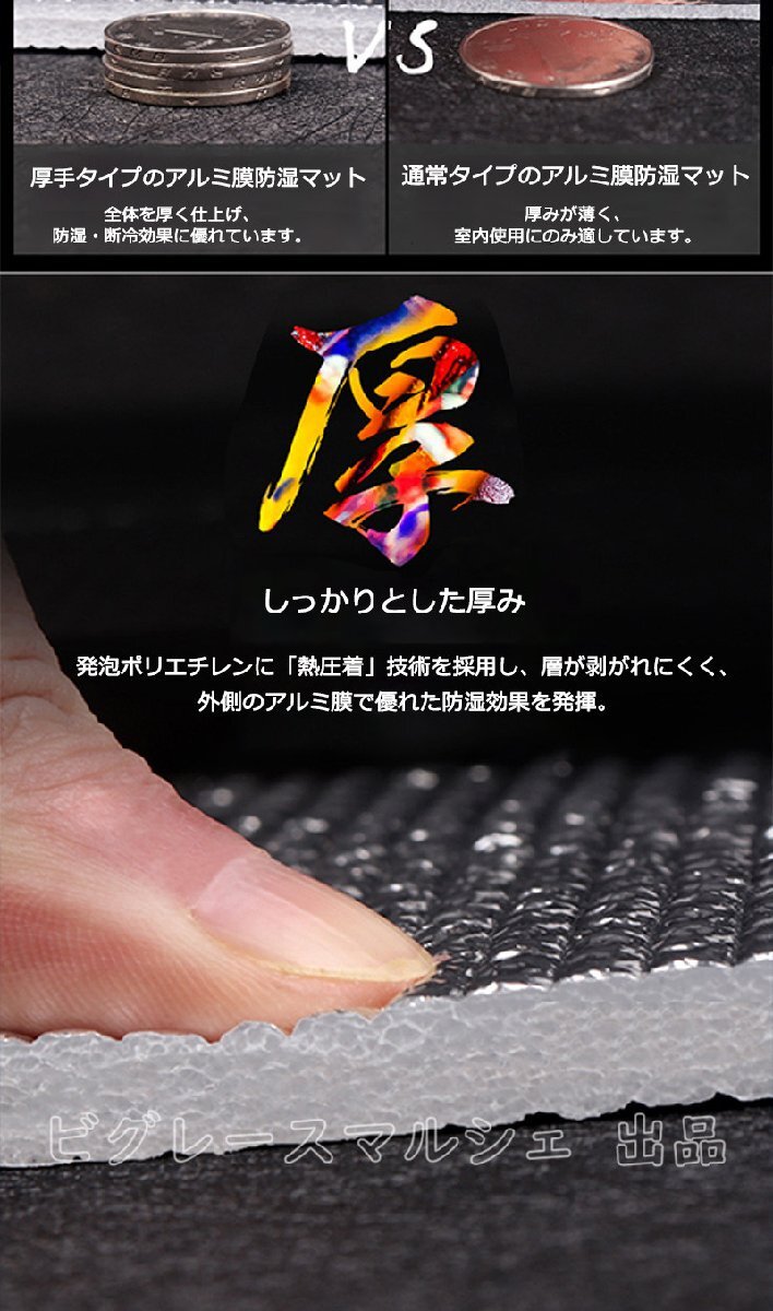 マットの表裏両面には防水アルミ膜を使用しており、優れた防水性と防汚性を実現。湿った地面でも安心して使え、お手入れも簡単です。