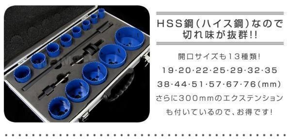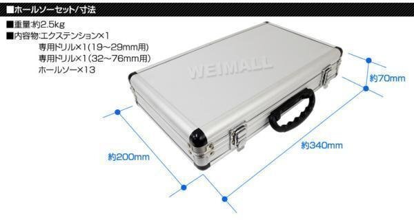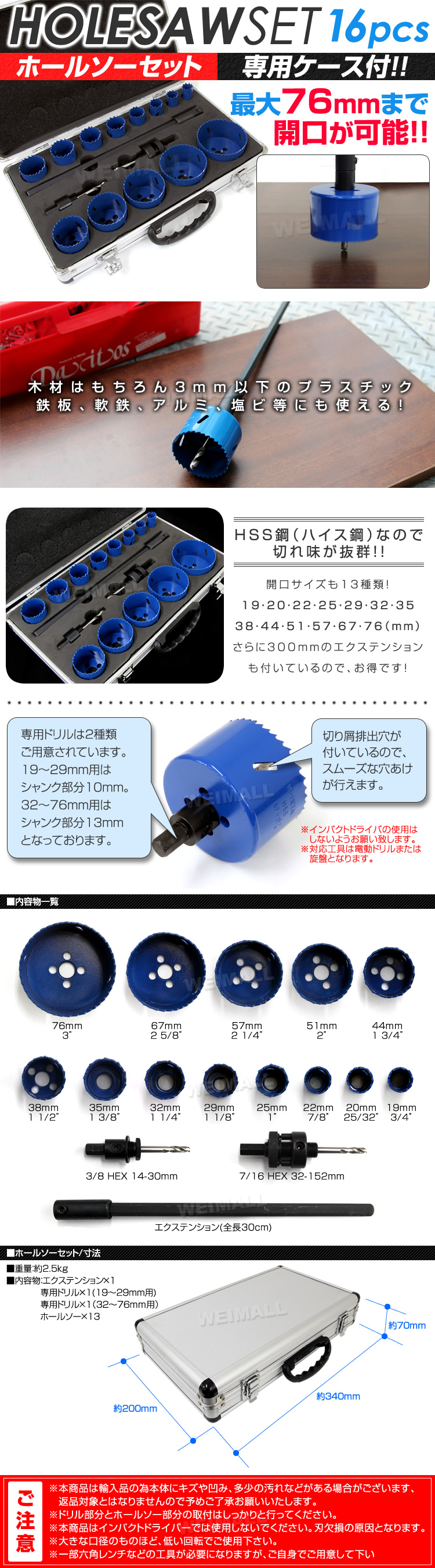 鉄板やアルミニウムのほか、木材等に穴を開ける際に重宝します。 13種類のホールソーが付属されているので、用途に合わせて選ぶことができます。 お手持ちのドリルなどで使用頂けます。 専用ケース付きで持ち運び・保管に便利! 【商品仕様】 用途:3mm以下の鉄板・アルミ・塩ビ・プラスチック・木材などの穴あけに ホールソーサイズ:19・20・22・25・29・32・35・38・44・51・57・67・76mm 材質:HSS鋼(ハイス鋼) 重量(約):2.5kg 【商品内容】 ホールソー ×13 専用ドリル(19~29mm用)×1 専用ドリル(32~76mm用)×1 専用エクステンション(300mm)×1 【注意事項】 ・ドリル部とホールソー部の取り付けはしっかりと行ってください。 ・穿孔面に強く当てたり、硬いものにぶつけたりすると、刃の破損を起こしますので当てないようにしてください。 ・噛み込みや破損の原因になりますので、極端な回転数の変動は避けてください。 ・大きな口径のものほど、低い回転数でお使いください。 ・インパクトドライバーの使用はしないようお願いいたします。 ・一部六角レンチなどの工具が必要になります。お客様ご自身でご準備ください。 ・専用ケースはサービス品となっておりますので、ケース内外に多少の傷やへこみなどがございましてもクレームの対象外となります。 ・当商品を使用した際に発生したトラブル、事故につきまして、当社は一切の責任を負いかねます。 ・当商品は入荷の時期によりカラー、仕様などが変更される場合があります。ご了承下さい。 ●写真と実物は多少異なる場合がございます。あらかじめご了承下さい。 ●もちろん新品未使用品です。 |