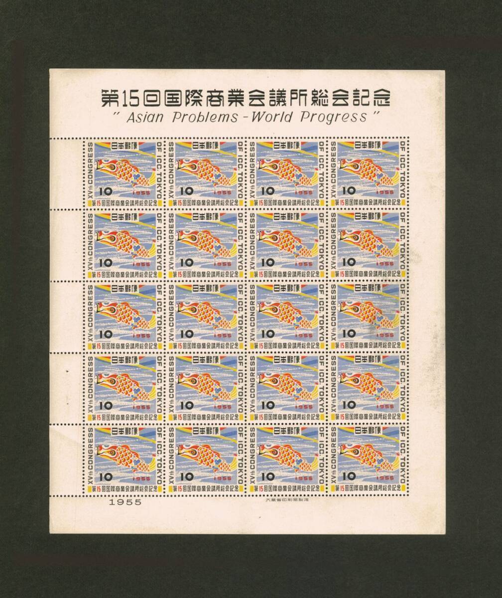 日本切手 シート 1955年 第15回国際商業会議所総会記念「こいのぼり」 未使用 ピンホール、汚れ、折れ目有