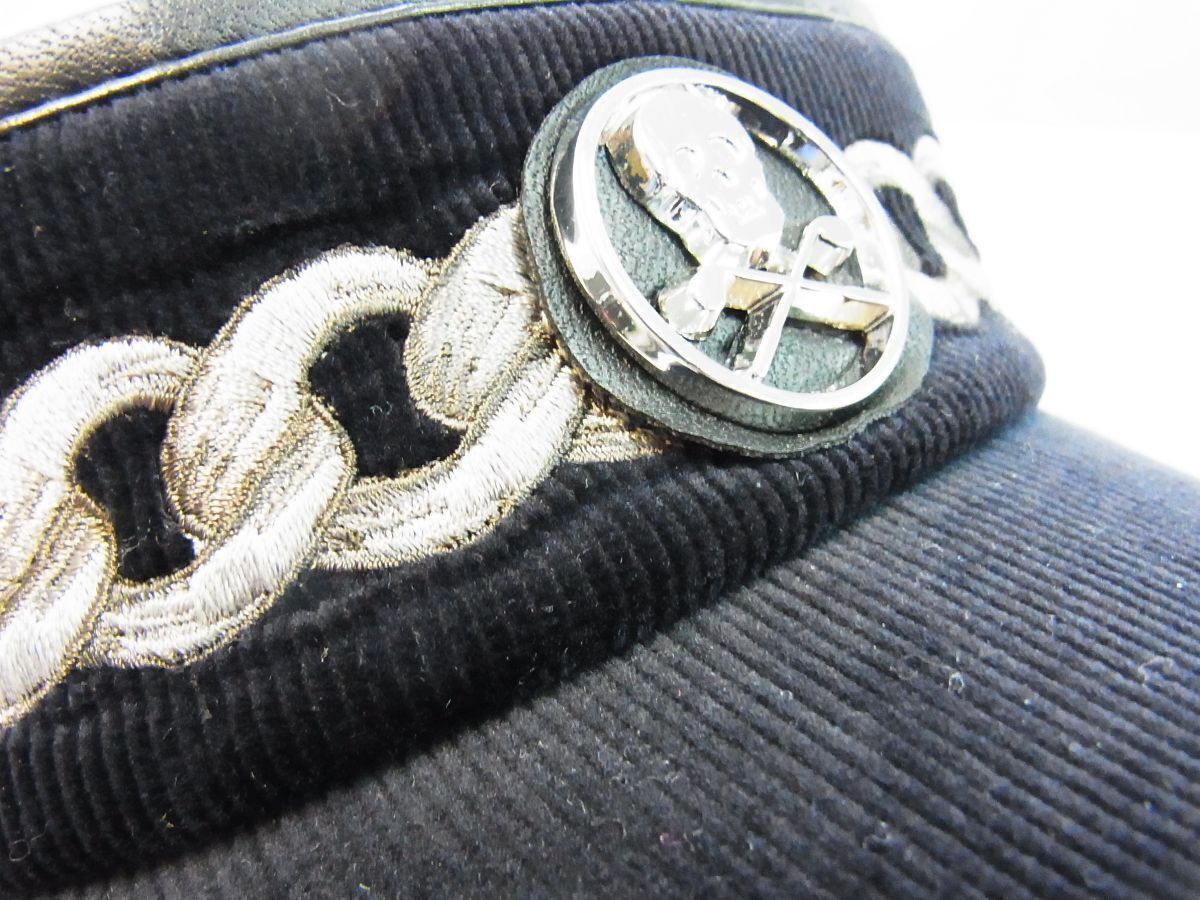 商品説明:コーデュロイ素材に、チェーン立体刺繍を大胆に施したサンバイザー。フロントにシンセティックレザーの台座が付いたカシメ式のサークルスカル金属バッジを装着し、重厚感のあるイメージに仕上げています。ひさしの先にメタリックな切り替えを入れ、華やかな印象もプラス。サイドとアジャスターにMARK&LONAのロゴをメタリック刺繍で表現しています。