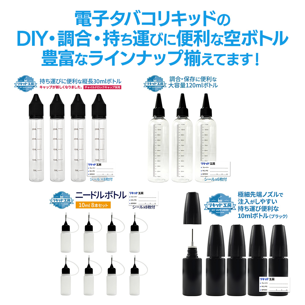 ユニコーンボトル 30ml 4本セット ※空ボトルです。<キャップが変わります> このたび、チャイルドロックキャップを採用しました。9月14日以降の発送分より新しくなっております。【セット内容】便利な目盛り付き30mlユニコーンボトル4本 製作用ステッカーシール8枚【便利な目盛付きボトル】0.5ml単位の目盛は注入量を容易に確認できリキッドの製作、調合、詰め替え、保存等DIYに大活躍 大変便利です。フレーバー、調合内容、日付が書き込める便利なステッカーシール付き【持ち運びに便利な縦長スタイル】直径約21mmの縦長ボトルです。ケースやカバン、バック、ポケットに入れて持ち歩いてもかさばりません。オリジナルの注入ノズルはアトマイザーやカートリッジにリキッドを注入するのが簡単です。【サイズ】縦:130mm 横:21mm 容量:30ml(目盛りは25mlまで) PETプラスチック樹脂製(注 高温の液体を注入しないでください。容器が変形したり溶けたり破損します。又、直射日光が当たる場所や車内等高温になる場所での保管は避けてください。)【60日間製品保証】商品の初期不良および購入後60日間に不具合などが生じた場合、弊社(プルプラジャパン)にて無償交換いたしますので、安心してご購入くださいませ。お問い合わせの際は、弊社カスタマーサポートまで注文番号を添えてご連絡ください。PL保険加入済み