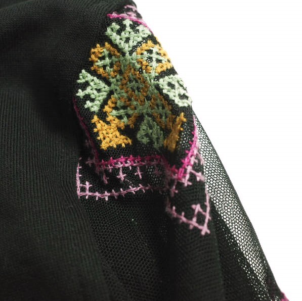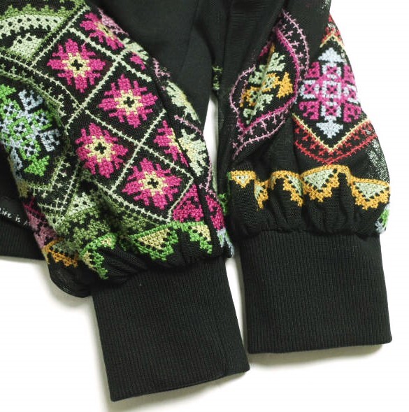 このオーバーサイズフーディには、マルチカラーのエスニック刺繍とレースのアップリケをプラスしたセミシアーなパフスリーブを組み合わせており、ロマンチックに仕上げています。