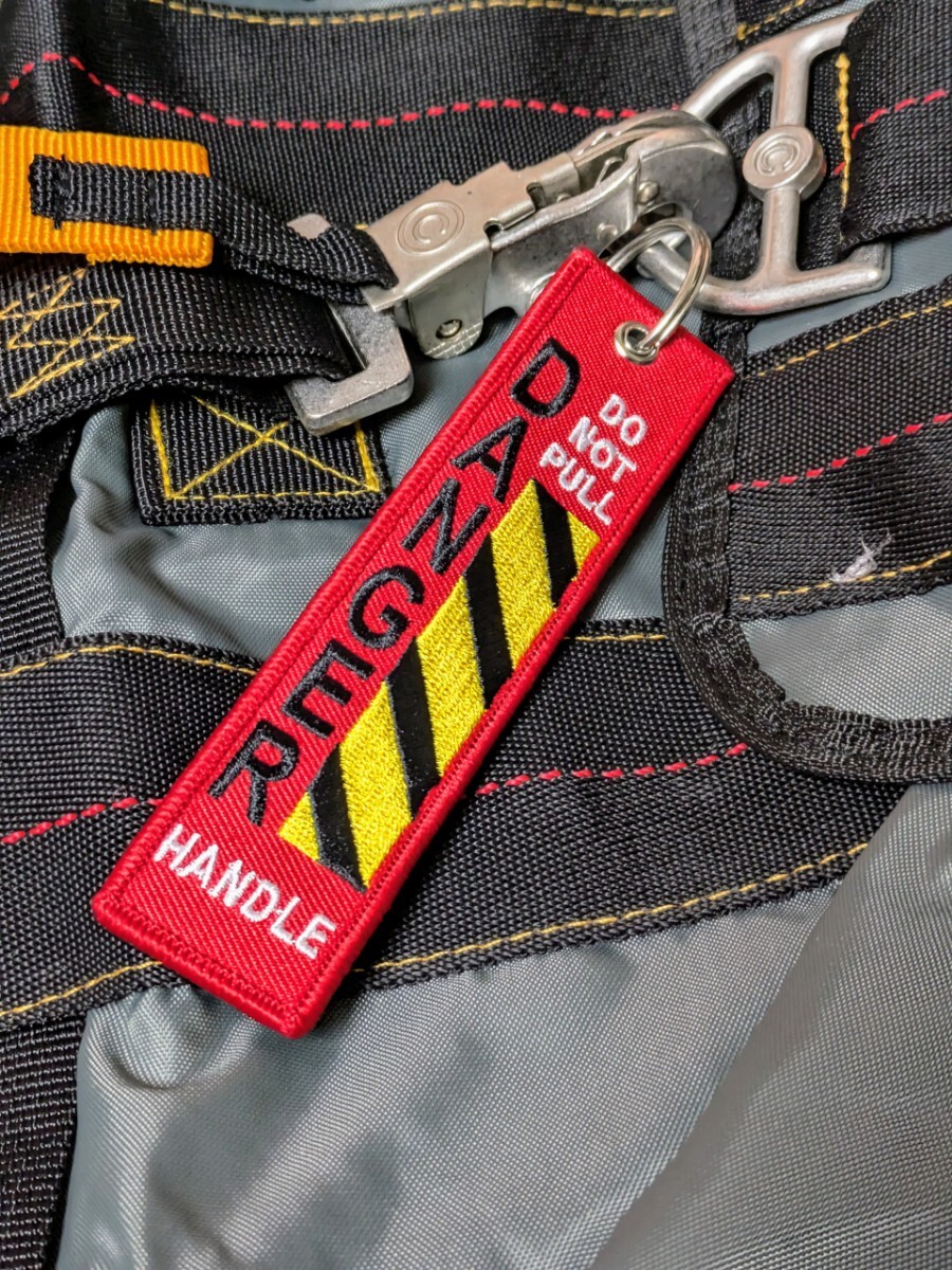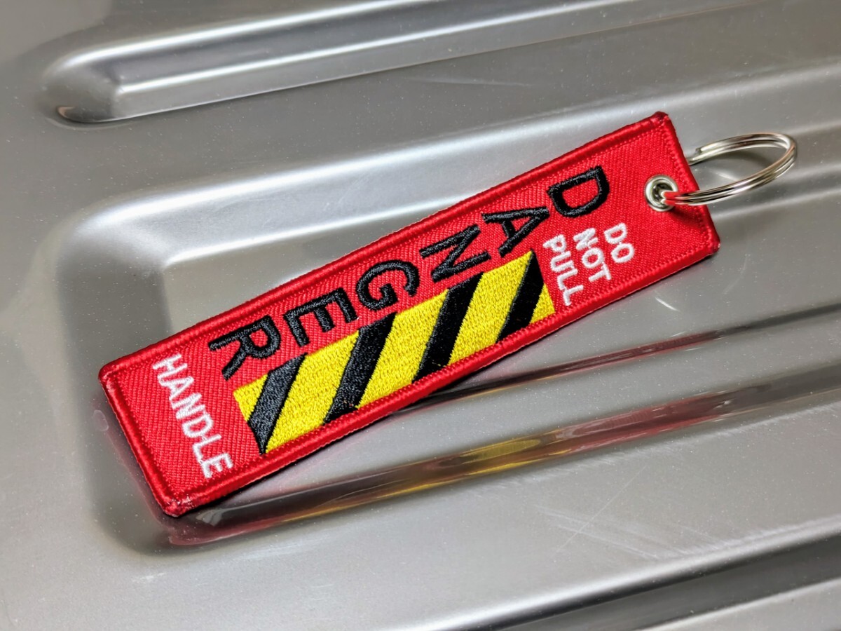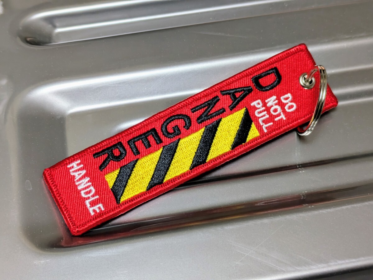 DANGER 取り外し禁止 警告の刺繍文字入れタグのキーホルダーです。