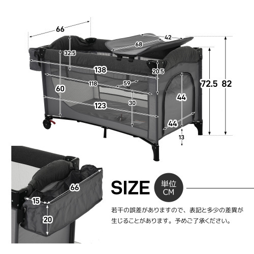 【ベビーベッド&ベビーサークル】 本商品はお昼寝用でけでなく、マットレスを下段に取り付けると、ベビーサークルとしてお使い頂けます。通気性と可視性の良いメッシュ素材を採用していて、家事などしていても外から中の様子が見えて安心です。【折りたたみ可能 持ち運び便利】 コンパクトの折りたたみ式で、場所が取りません。帰省と旅行などの場合携帯便利です。キャスター付きで持ち上がると移動し、置くと止まり、安全で移動しやすいです。【おむつ替えテーブル付き】おむつ替えテーブルが付きます。ママへの腰の負担が少なく、赤ちゃんにとっても衛生的!【優れた収納力】 サイトポケット付き、下段も収納スペースとしてお使い頂けます。お子様のおもちゃ、おむつ、日用品などを収納できます。【簡単組立】 ツール不要【安定感抜群】 ベッド下は7つの支持点があります。圧力を分散させる構造を採用しており、力が平均していて、横転しにくいです。【EN71取得済み】 本商品は EN71 を取得られていて、ISO 9001(品質マネジメントシステム規格)、ICIT 認証、FCCA 認証取得られている工場で生産したのです。 乳幼児向け製品は【EN71】という規定が発行され、対象年齢や使用目的など、様々な角度から玩具の安全性について検査されます。【商品仕様】素材 : 本体:オックスフォード(非防水)昼寝マット:MDF+ウレタン 脚部:スチール+プラスチック 梱包数:1 対象年齢:下段0~3歳、上段0~6ヶ月 重量(Net weight):11.2kg 重量(Gross weight ):12kg 耐荷重:下段30kg、上段30kg