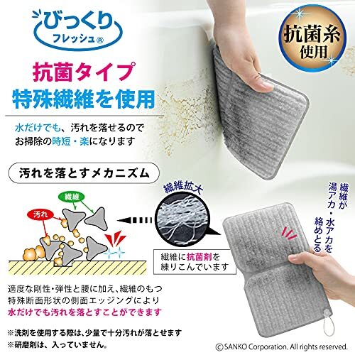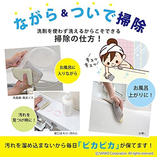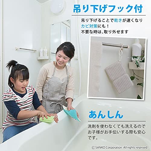 ・【洗剤不要】洗剤を使用せず汚れが落とせるので、手荒れ、節水対策、お子様のお手伝い、ながら掃除(お風呂に入りながら)ができます。使用する場合でも少量で汚れが落とせます。【抗菌加工】菌の繁殖を抑制します。【吊りひも付き】保管や水切りに便利です。紐は、取り外し可能。