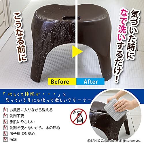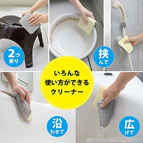 水だけで湯アカ汚れを落とすことができるバス用スポンジです。 抗菌加工を施した糸を使用、菌の繁殖を抑制します。 洗剤を使用する場合でも、ごく少量で十分汚れが落とせるため経済的です。 洗剤を使わず洗えるので、お風呂に入りながらの掃除やお子様のお手伝いにも役立ちます。 気づいた際にサッとお掃除できるクリーナーです。 手の小さな女性でもフィットしやすいサイズと厚みです。 クリーナーに折り目が付いているので、はさみ洗いができ、バスタブはもちろん洗面器や風呂イスなども洗いやすい仕様です。 浴槽の曲面も洗いやすい。 吊り下げフック付きで、保管や水切りに便利です。(取り外し可能) 浴室に置いていても目立ちにくく、なじみやすいグレーカラー。 3個入のセットです。