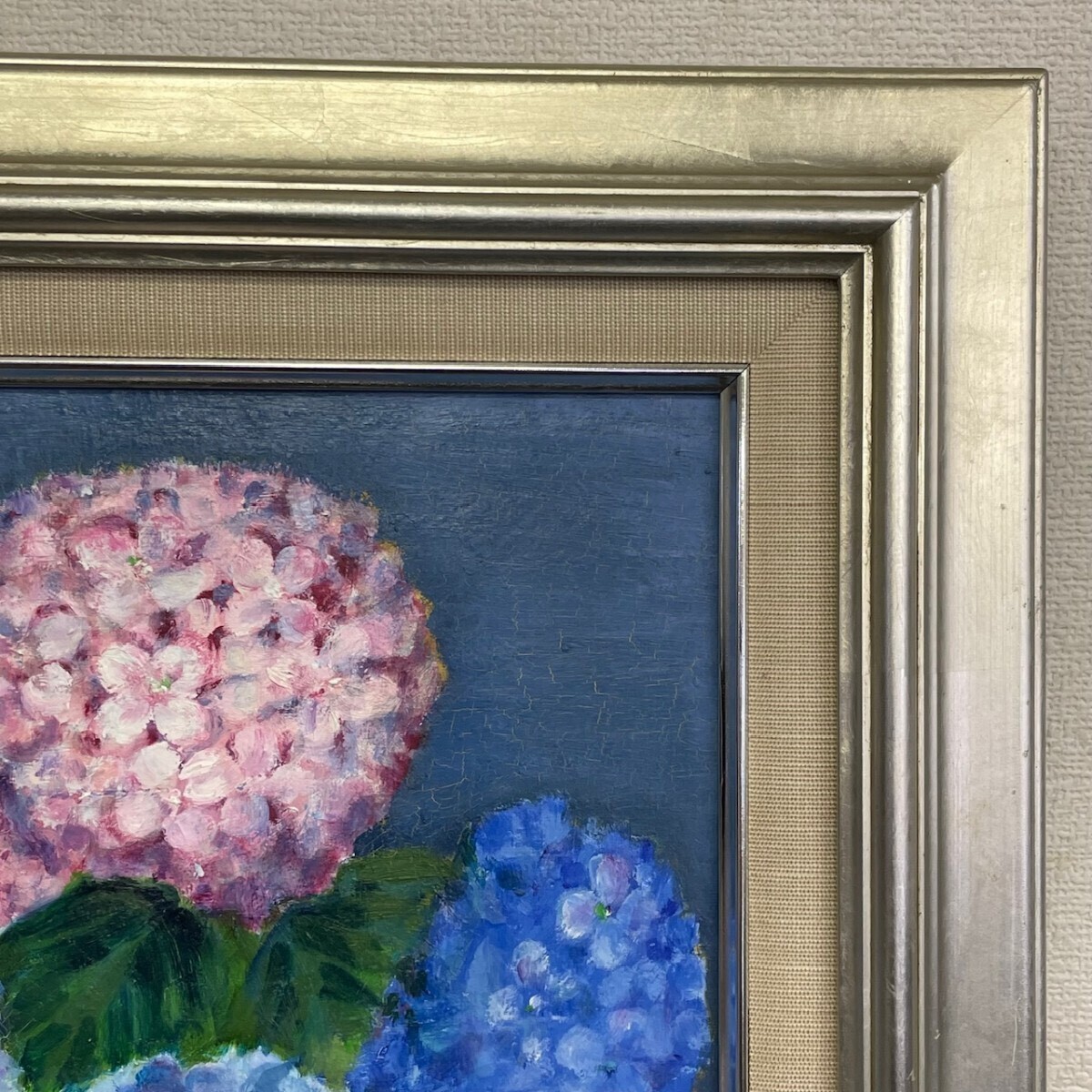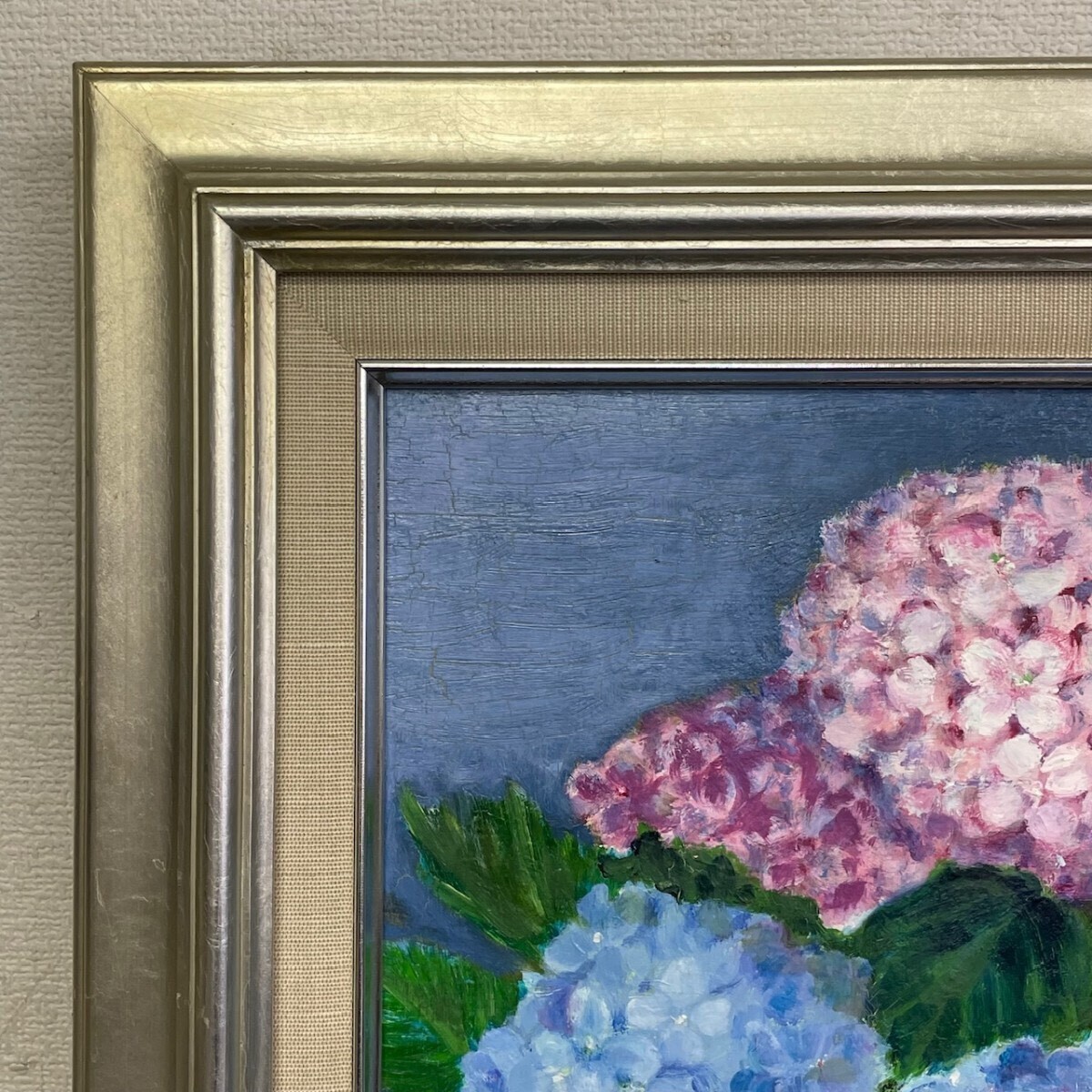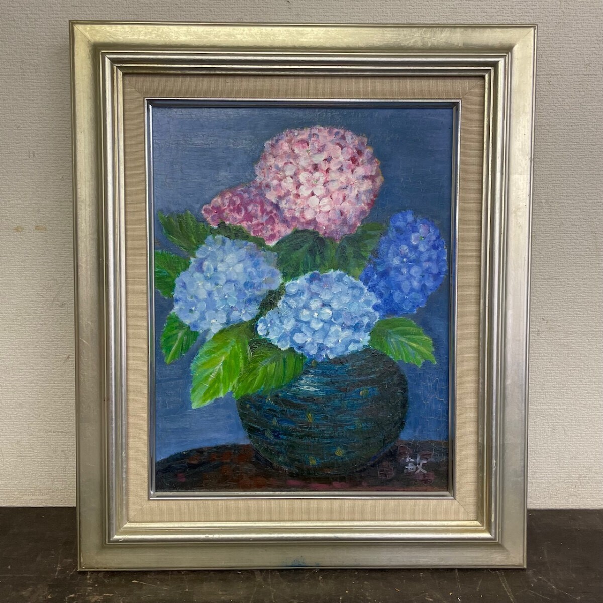 作者不詳 敏『紫陽花』 直筆サイン入り F3 油絵 静物画 額装 縦約56cm×横約47cm
