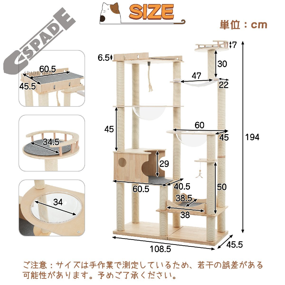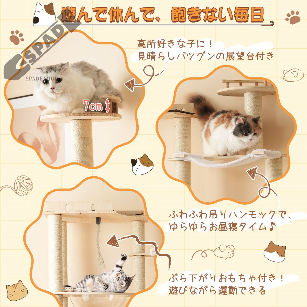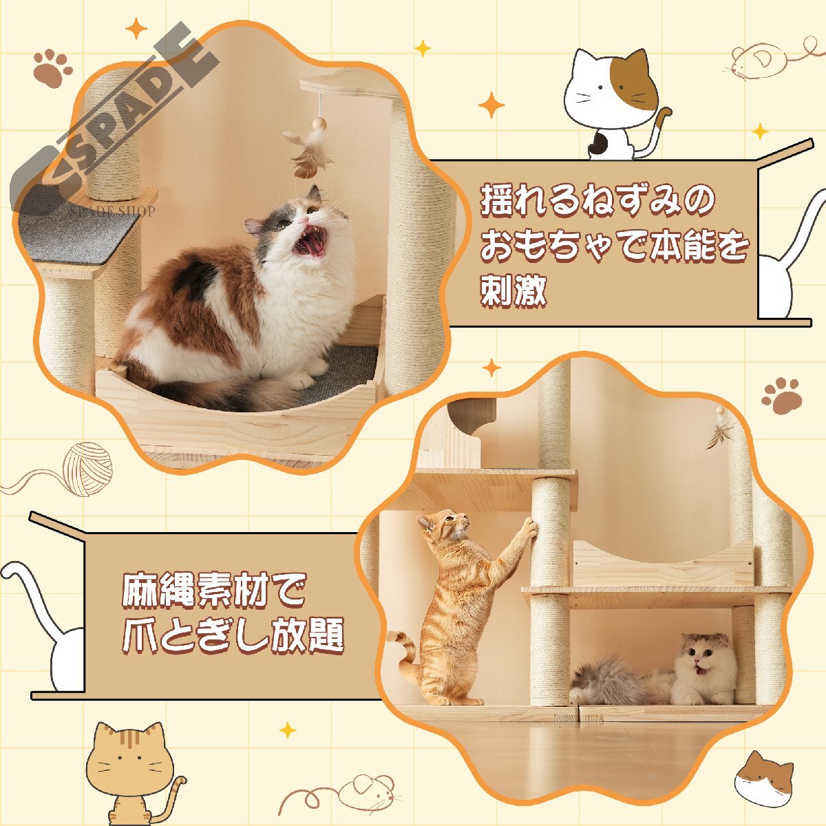 • ④【遊びながら本能を刺激する仕掛け多数】ぶら下がるネズミ型トイは好奇心を引き出し、運動不足解消にも最適。全ポール麻縄巻きで爪とぎし放題。猫ちゃんの健康的な爪とぎ習慣をしっかりサポート!