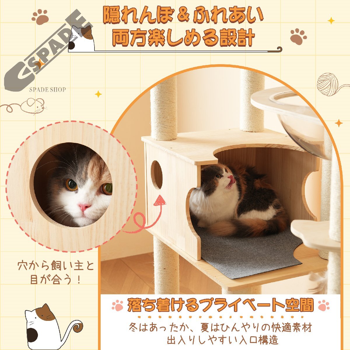 • ⑤【安心・安全の構造設計とこだわり素材】太くて頑丈な爪とぎ支柱に加え、高密度パーチクルボードを使用し、安定感と耐久性を両立。角は丸く加工されており、安全性にも配慮。季節に応じた素材選びで夏はひんやり、冬はあったか快適。