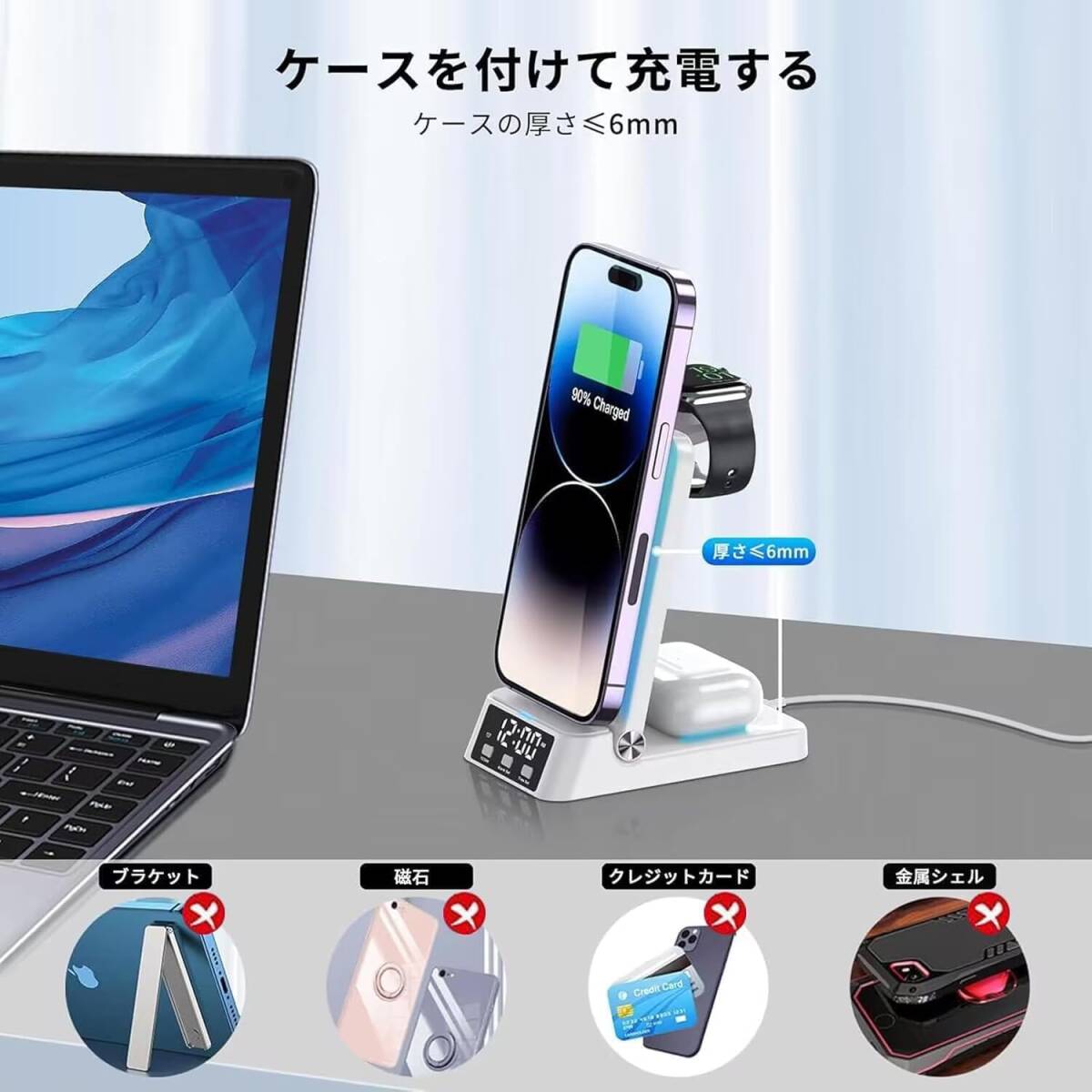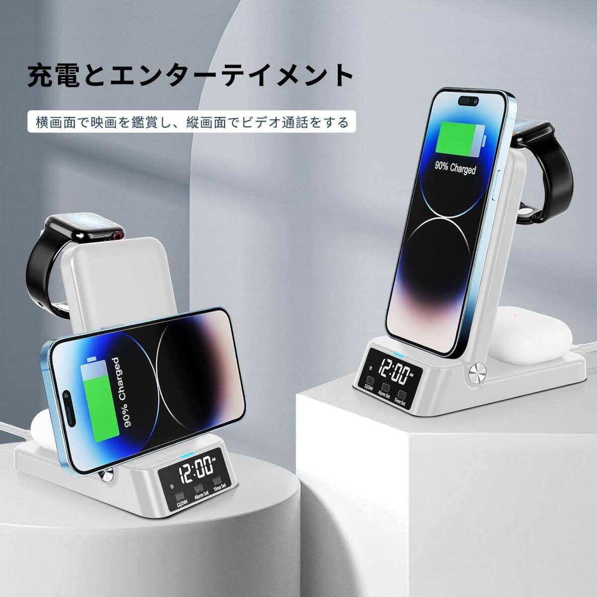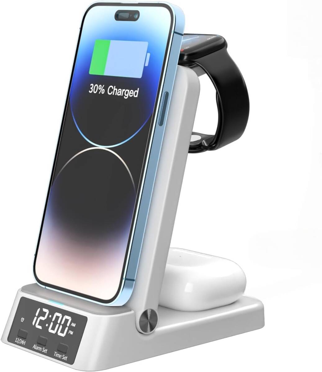スタイリッシュな男前デザイン 時間も分かる 4 in 1 ワイヤレス充電ステーション、急速充電器 充電スタンド 折りたたみ式