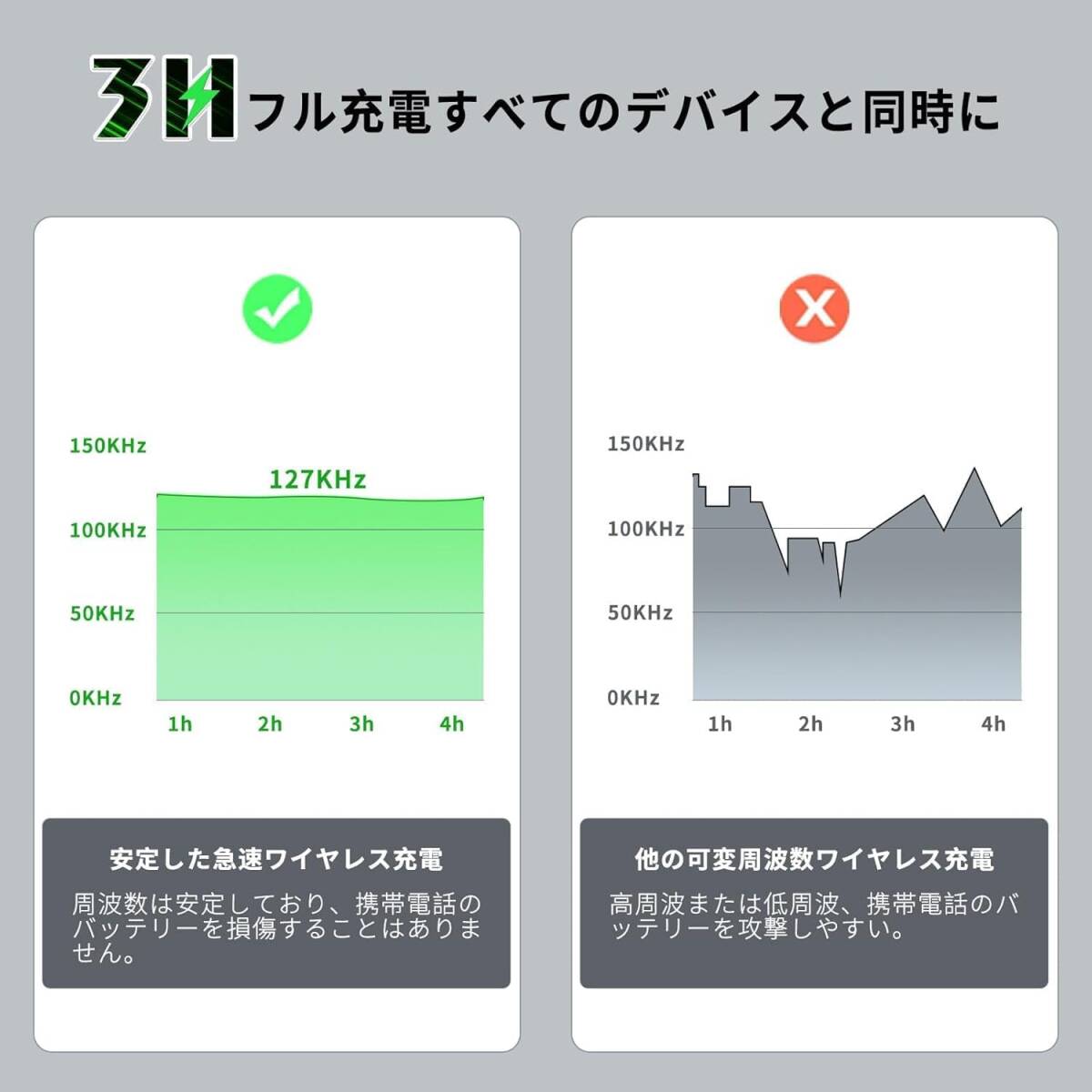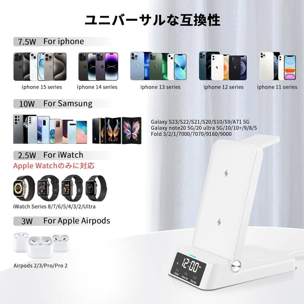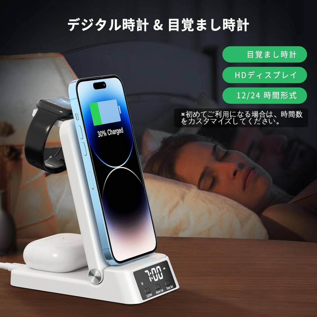 スタイリッシュな男前デザイン 時間も分かる 4 in 1 ワイヤレス充電ステーション、急速充電器 充電スタンド 折りたたみ式