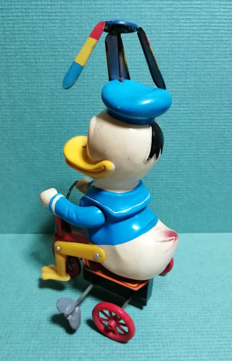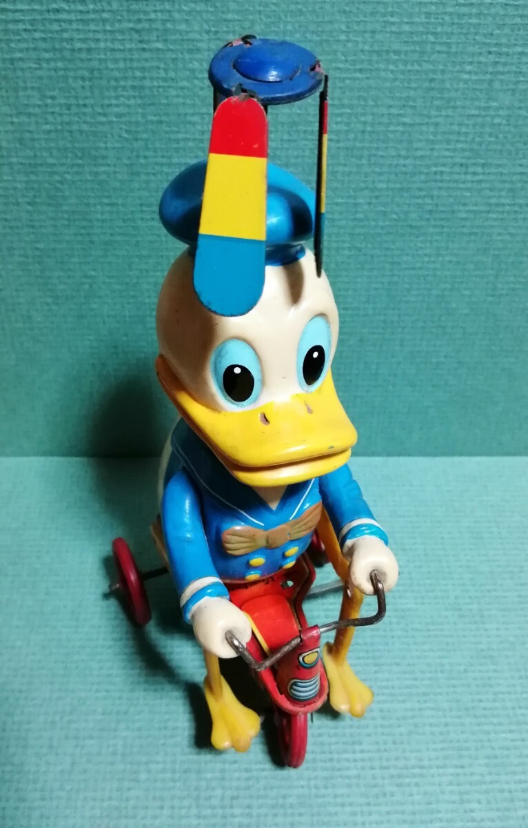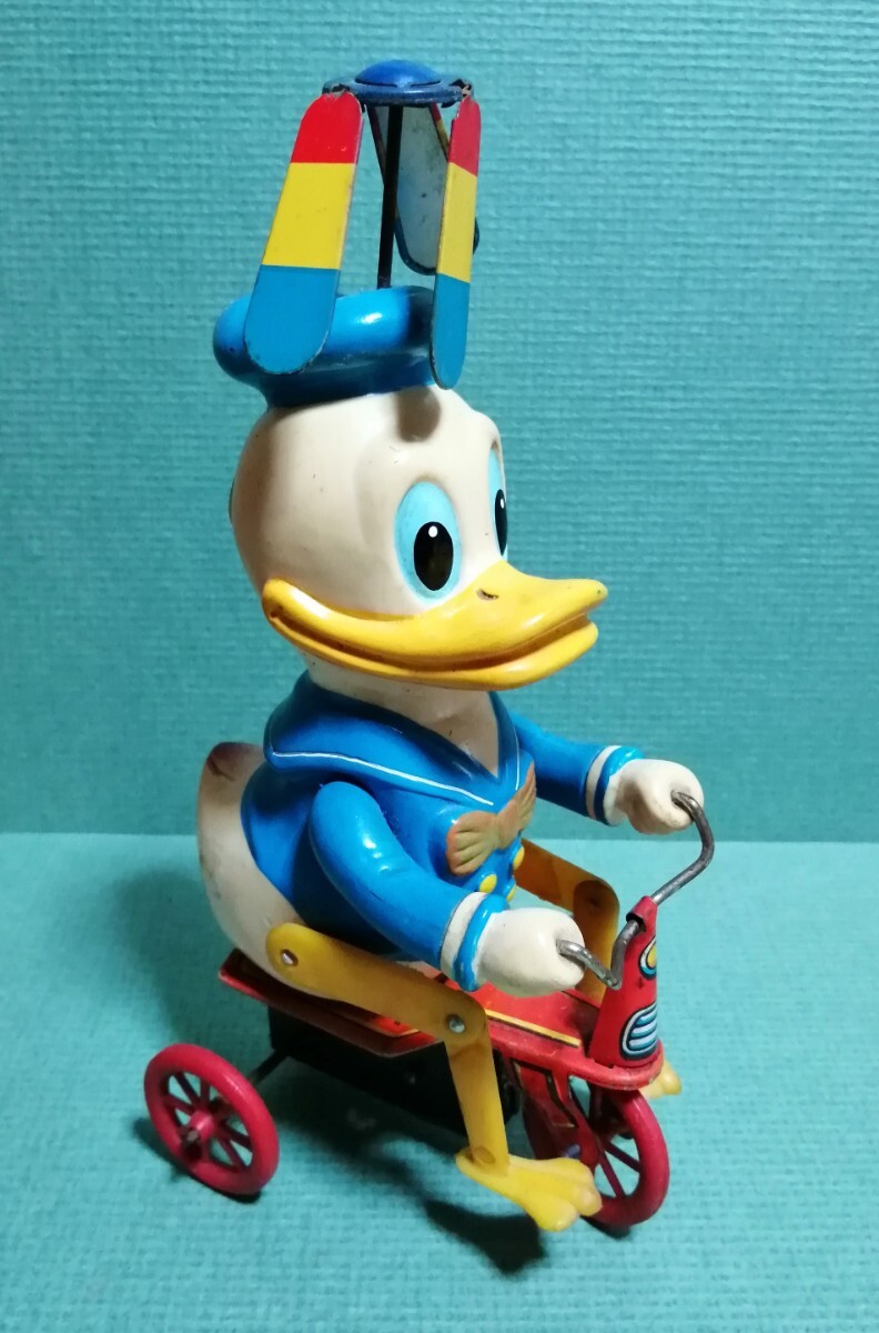 ドナルドダックの三輪車。増田屋。ブリキのおもちゃ。高さ約19cm。ネジを回して動きます。足の動きが面白いです。ハンドル、ネジの金属の所にサビがありますが、宜しくお願いします。
