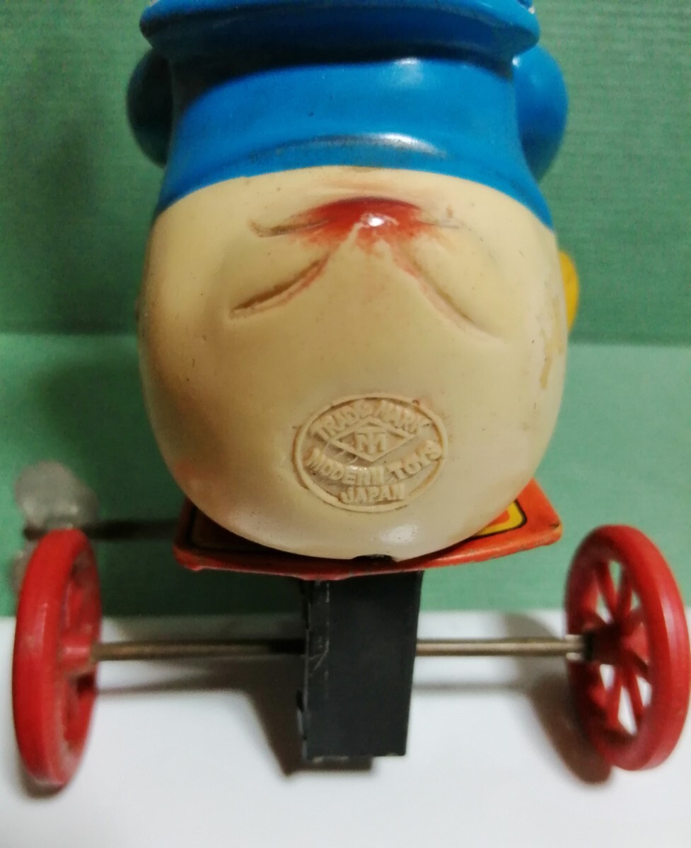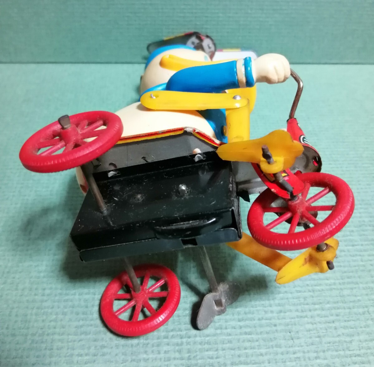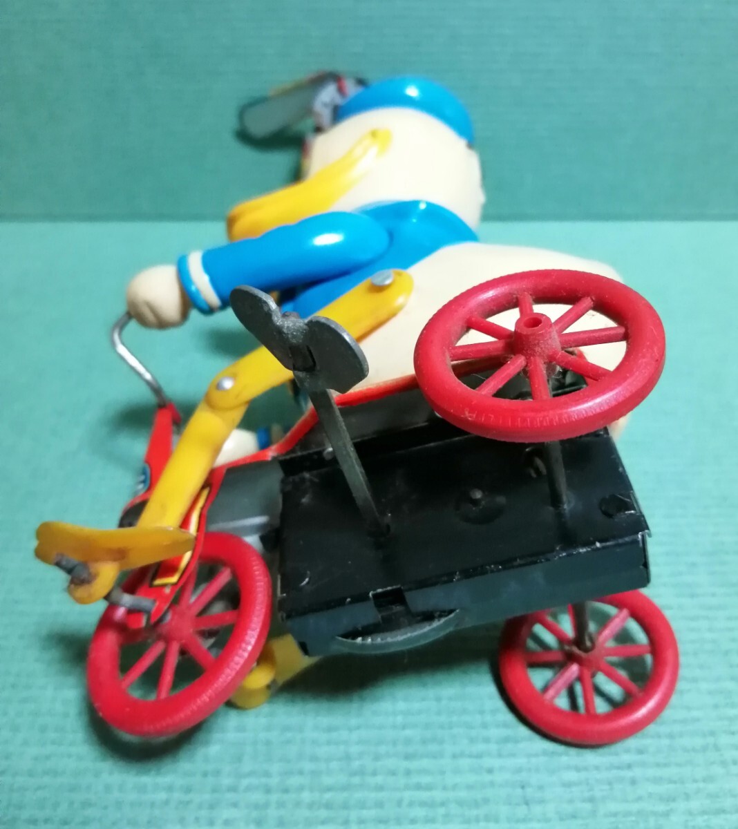 ドナルドダックの三輪車。増田屋。ブリキのおもちゃ。高さ約19cm。ネジを回して動きます。足の動きが面白いです。ハンドル、ネジの金属の所にサビがありますが、宜しくお願いします。