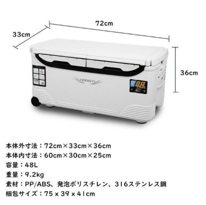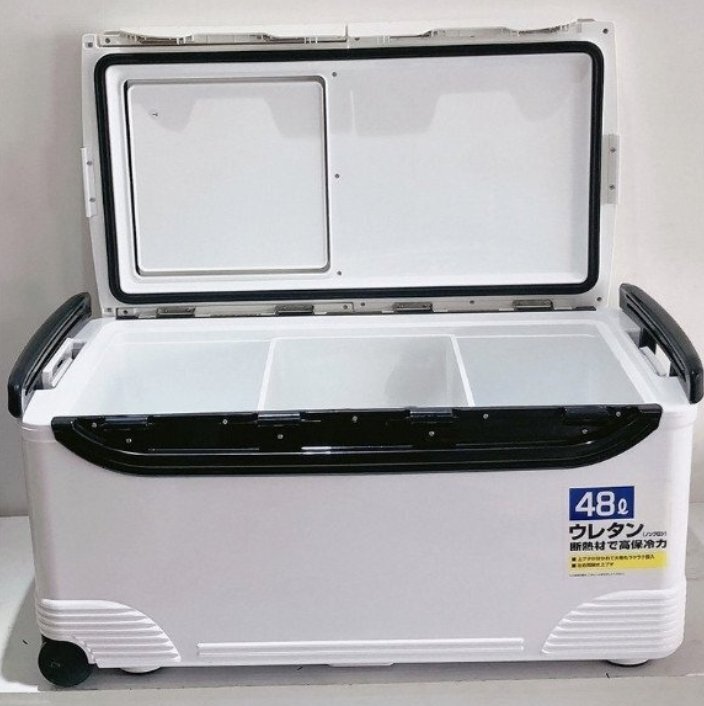 釣り用クーラーボックス 大容量 大型48L 座れる頑丈マッスルボディ 防水 サイドハンドル キャスター付 釣り 保冷力150h 水栓付き 白&銀