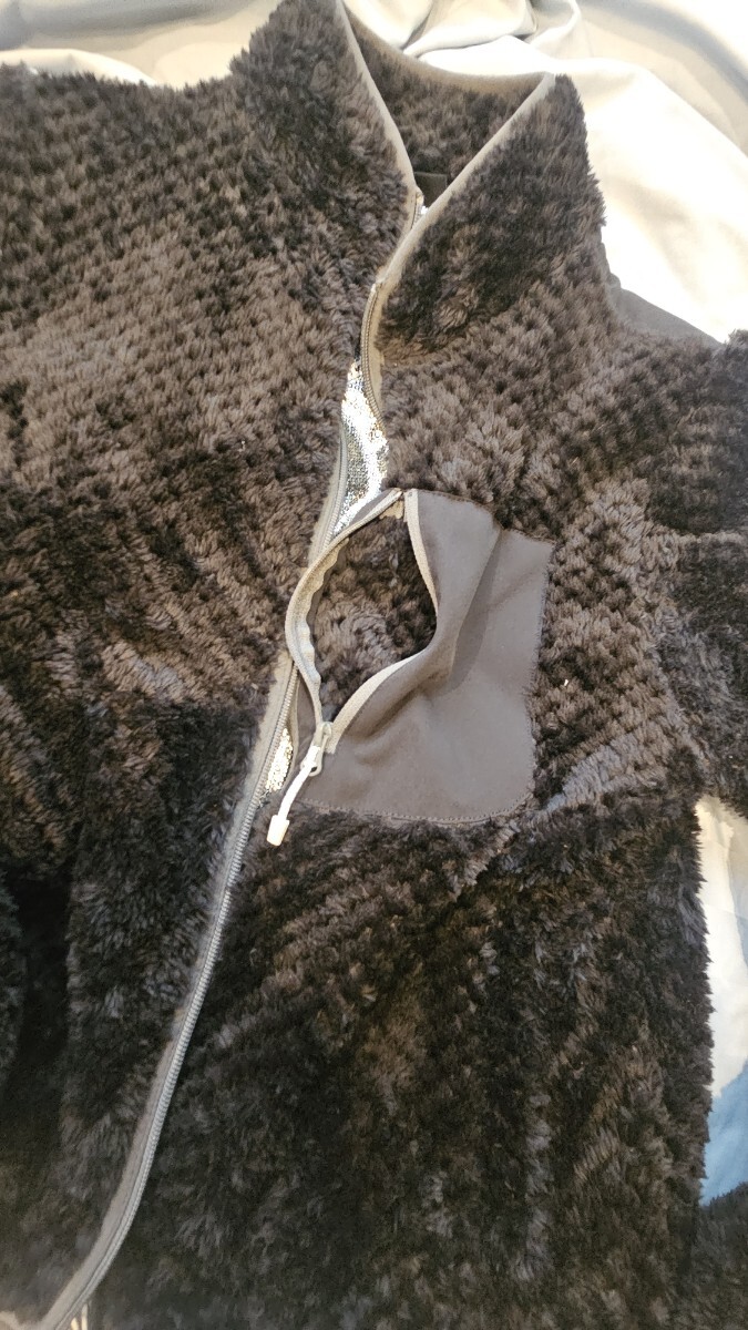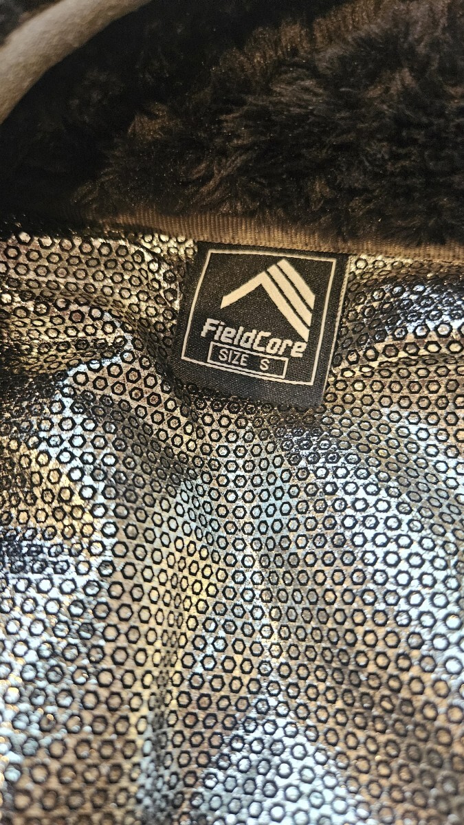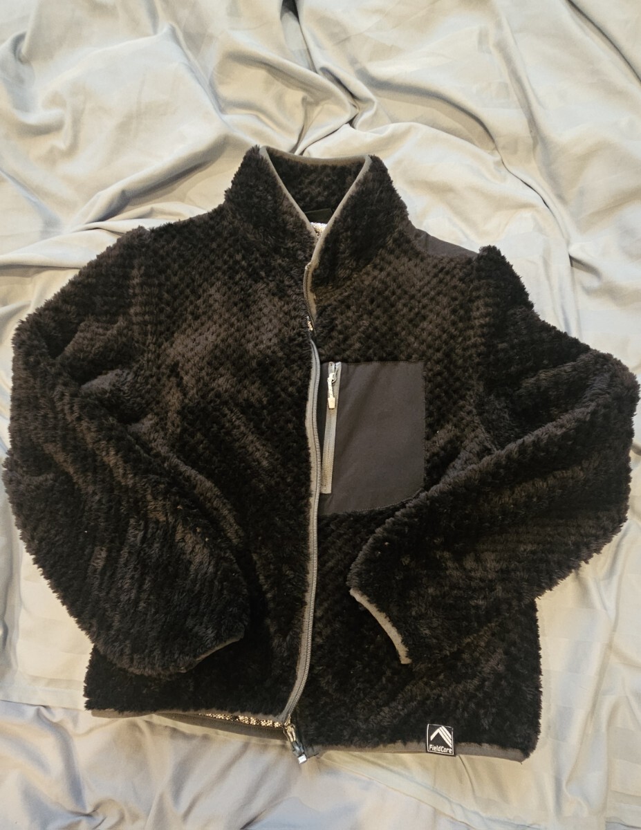ファー素材の黒いジップアップジャケット、Sサイズ、胸ポケット付き