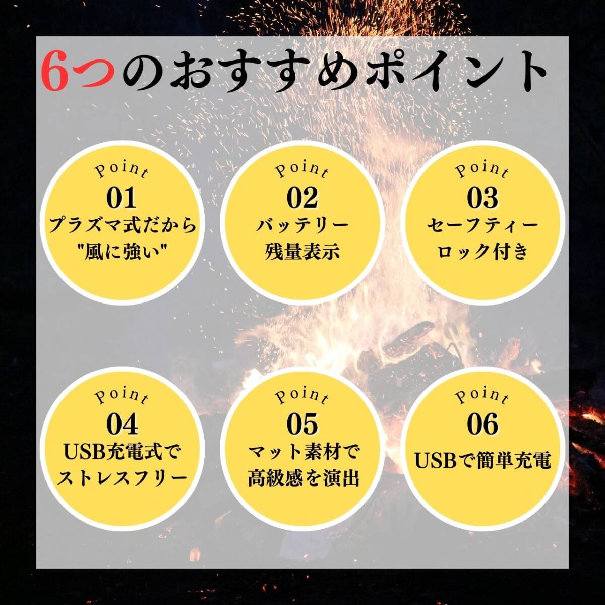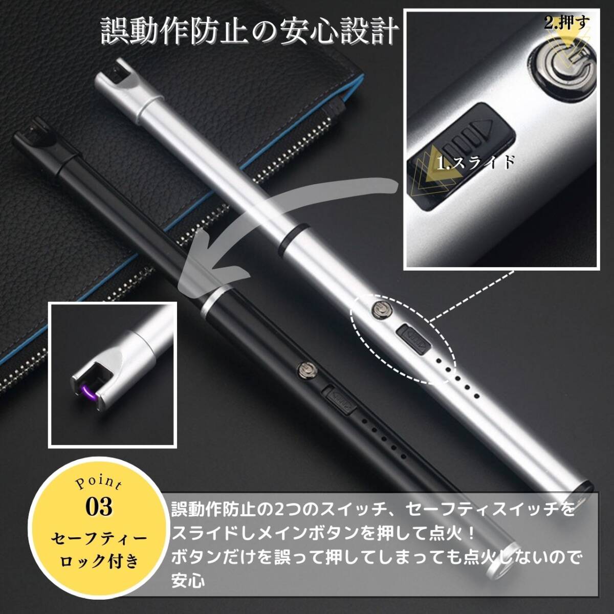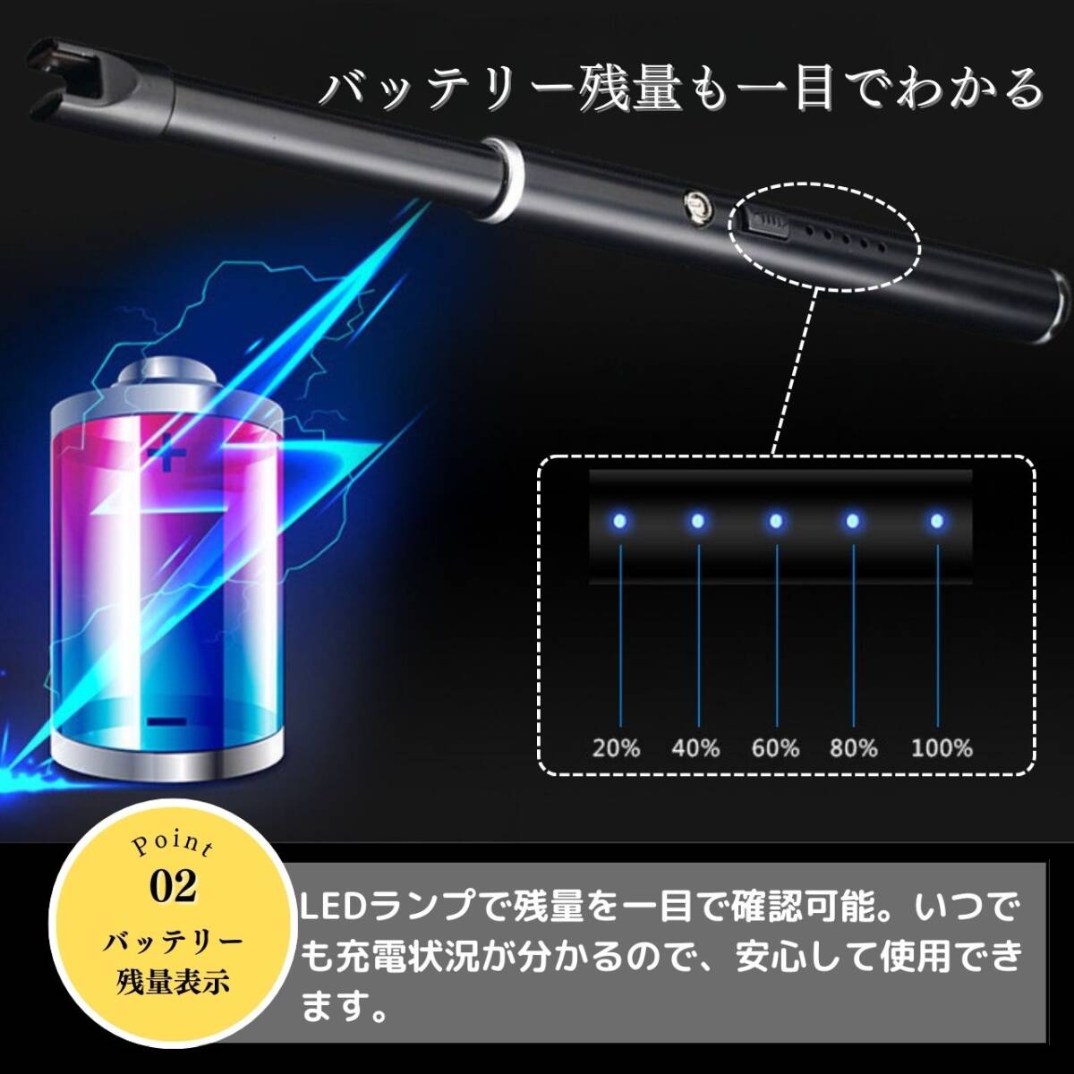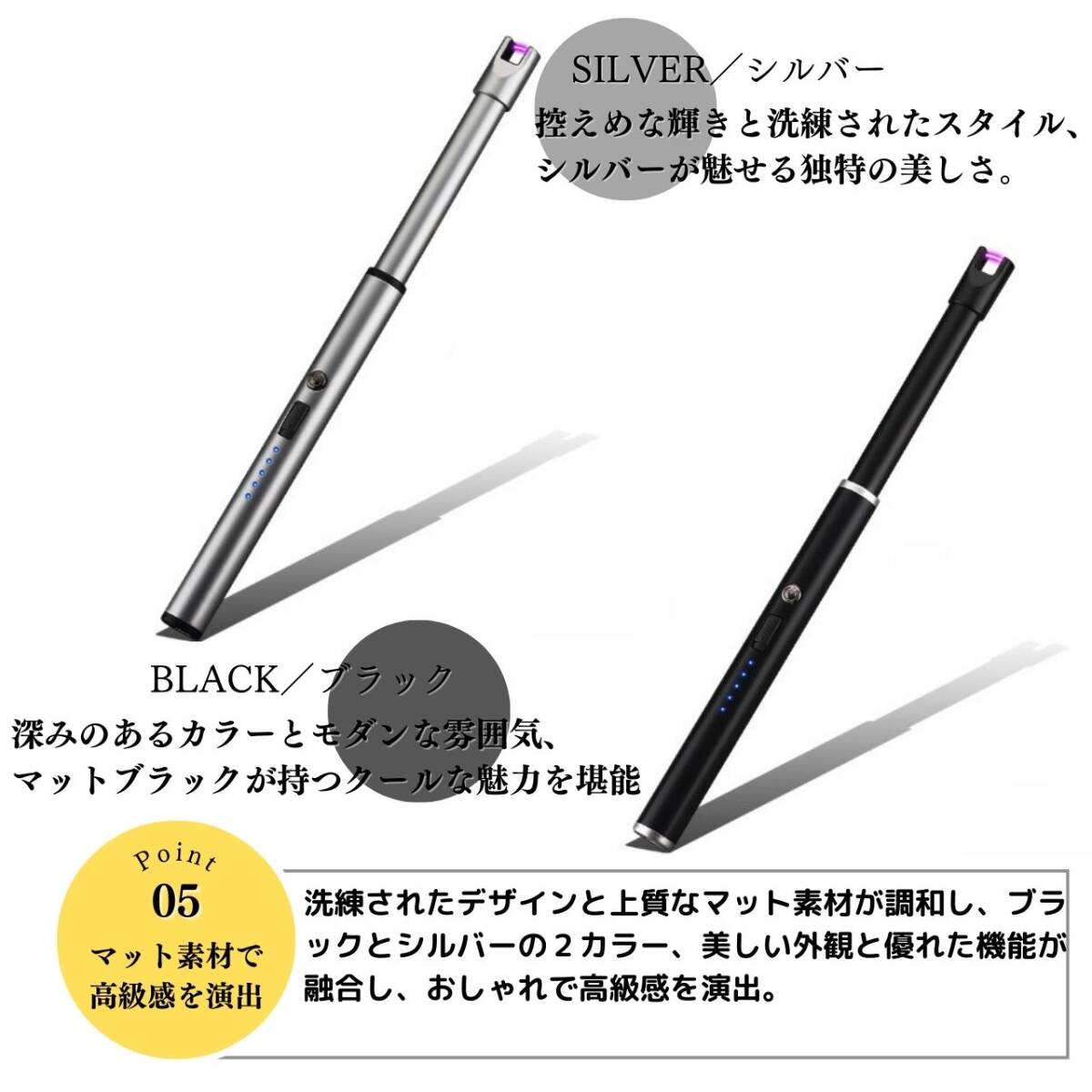 【カラー】タイトル、商品画像1枚目をご確認ください。【オイル・ガス不要で経済的】プラズマライターは電気を使用し、ガスやオイルの購入が不要なため経済的。手軽に入手できる電気を利用しています。【画期的な電撃着火】溶接などで使われるアーク放電によるプラズマを利用した画期的なライター。瞬時に着火して便利に使用できます。【風に強い炎がない着火方法】プラズマライターは炎が出ないため、風の影響を受けずにスマートに着火できます。アウトドアやレジャーにも最適です。【繰り返し使用可能なUSB充電】付属のUSBケーブルを使用して、自宅やオフィスのパソコンから手軽に充電できます。繰り返し使用が可能で、経済的で環境にも優しいです。【安全ロック機能付き】安全ロックをスライドさせて解除し、電源ボタンを押して電源を入れます。使用後は必ず安全ロックをロックしてください。【使用方法】☆電源スイッチの入れ方☆安全ロックをスライドさせ解除し、電源ボタンを押して電源を入れます。使用後は必ず安全ロックをロックしてください。☆充電方法☆付属のUSBケーブルを使用して、パソコンなどのUSBポートへ接続し充電を行ってください。本体の底面の接続口に差し込み充電します。電池残量は約20%ごとに点灯致します。プラズマライターは燃料を気にすることなく、電気を使って便利に着火できる画期的なアイテムです。経済的で風に強い着火方法をぜひお試しください。【注意事項】・海外製品のため多少の傷や汚れ等ある場合がございます。・送料の都合上箱なし簡易包装での発送となります。コメントなしでの即購入可能です。おまとめ買いでお値引きさせていただきます。お気軽にコメントください。BLACK ブラック 黒 SILVER シルバー 銀 アウトドア キャンプ 便利 簡単