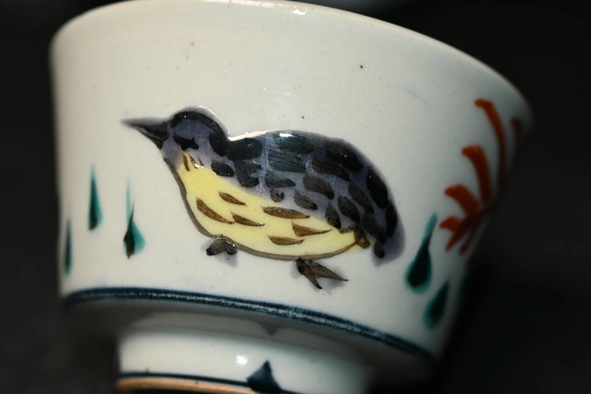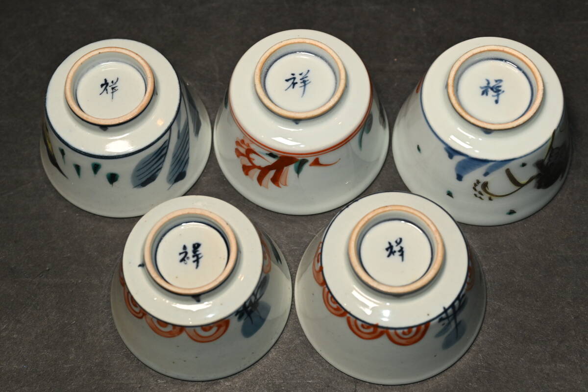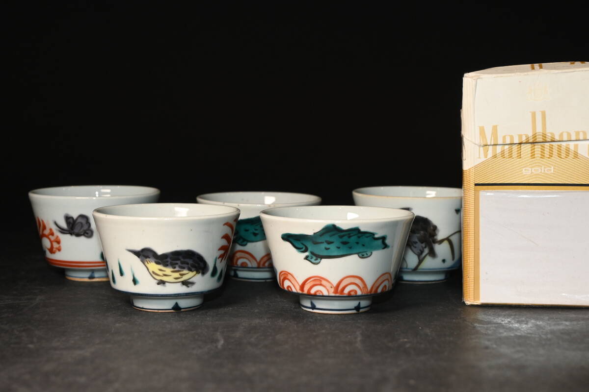 真贋保証■小野祥瓷 造■ 色絵絵変 ぐい呑 五客 共箱 姉は小野珀子 父は小野琥山 会津若松市生 琥山窯 魚 鳥 蝶 酒器 酒盃 酒杯 図替 絵替 | |||