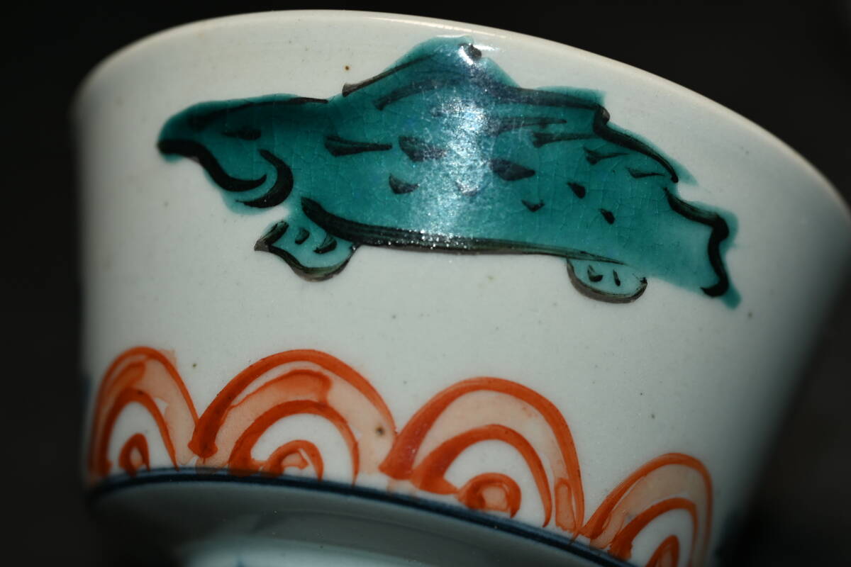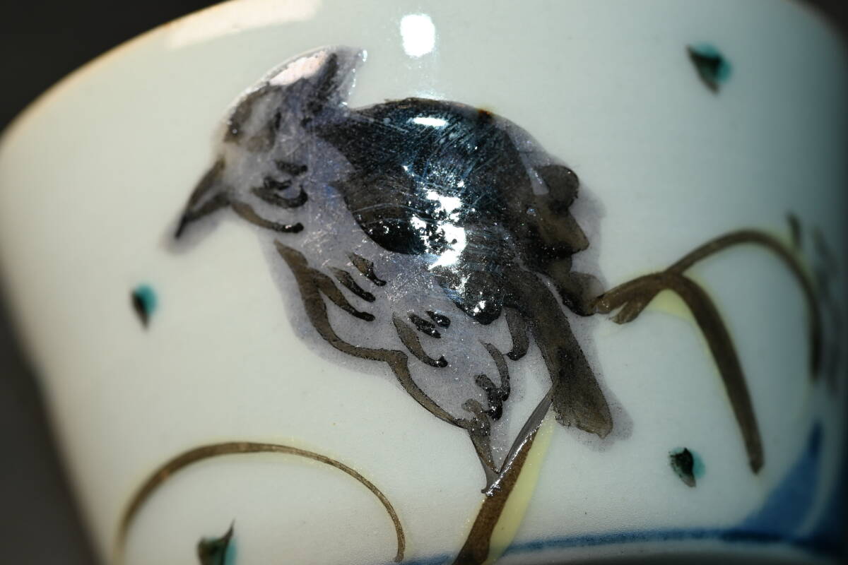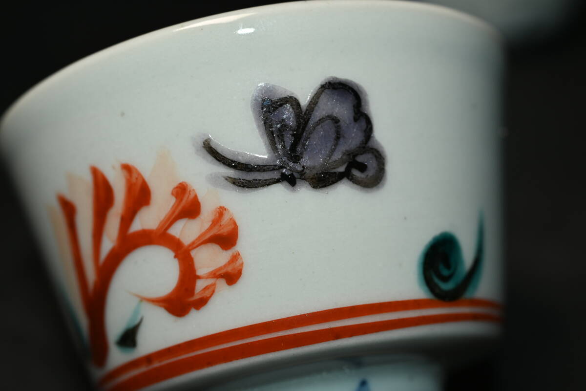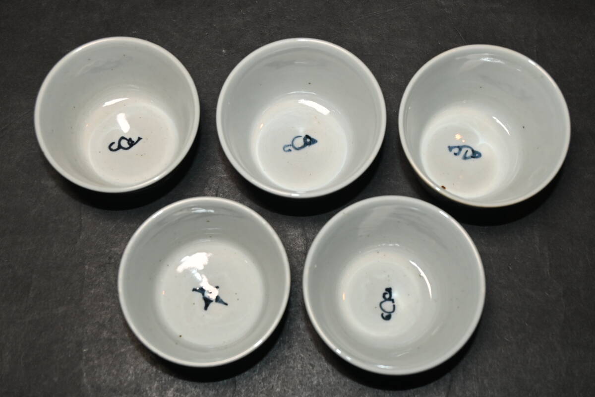 真贋保証■小野祥瓷 造■ 色絵絵変 ぐい呑 五客 共箱 姉は小野珀子 父は小野琥山 会津若松市生 琥山窯 魚 鳥 蝶 酒器 酒盃 酒杯 図替 絵替 | |||