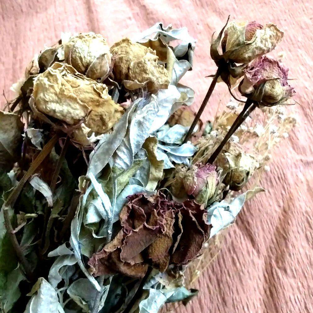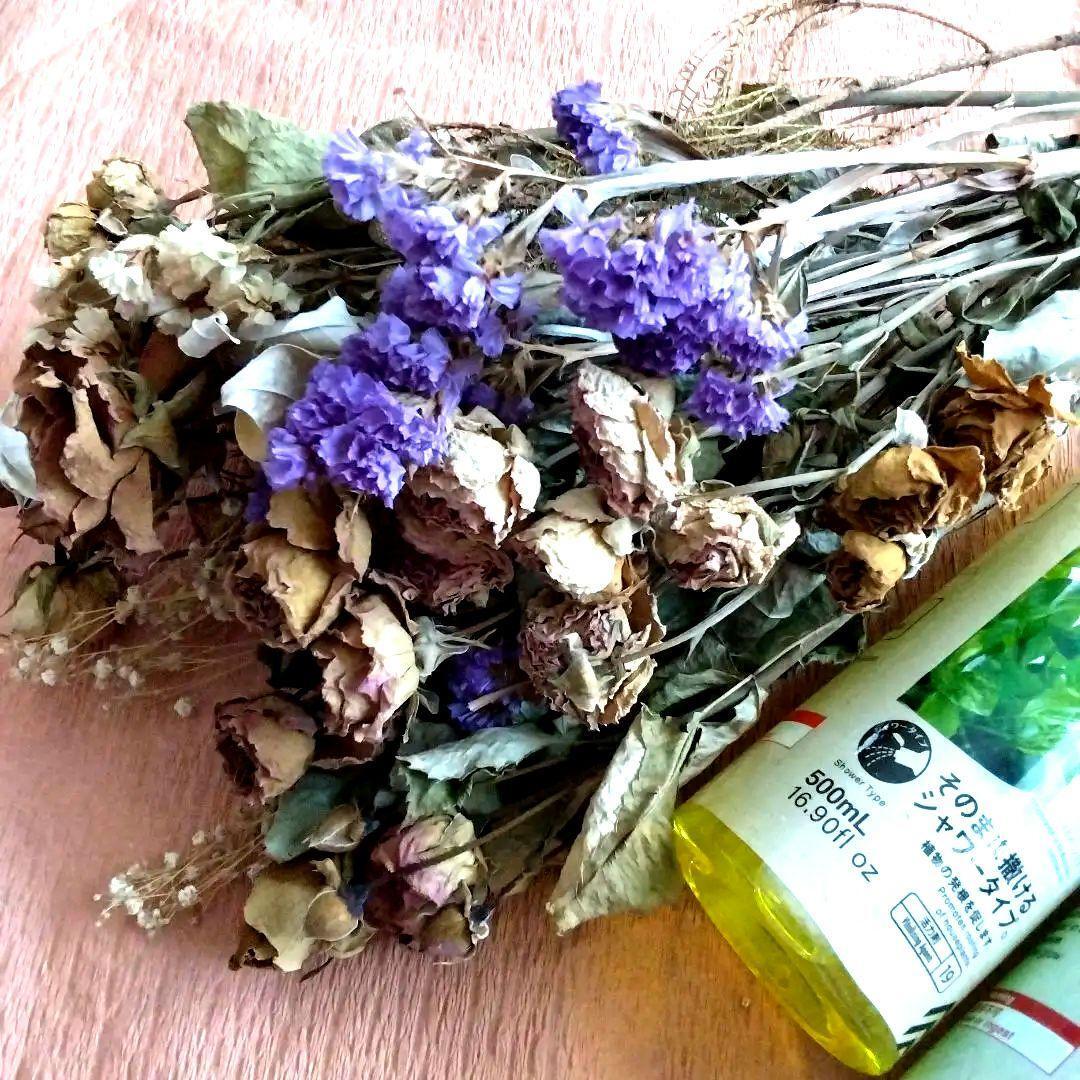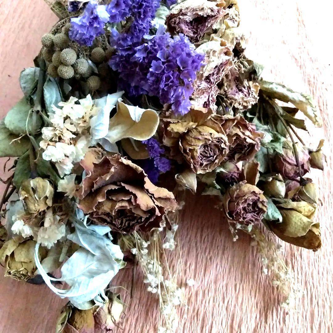 ドライフラワーは、アンティークカラーの薔薇、スターチス等、45cmぐらいです。