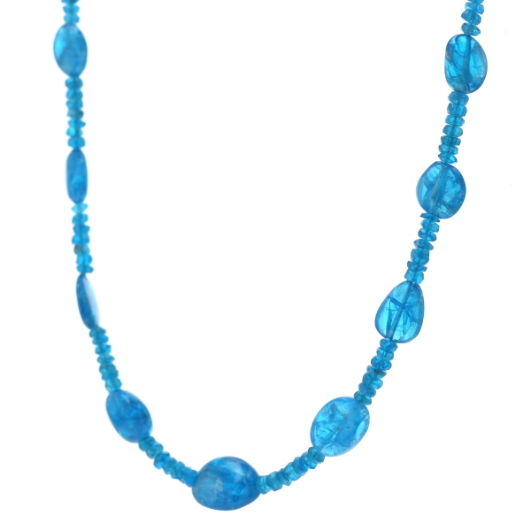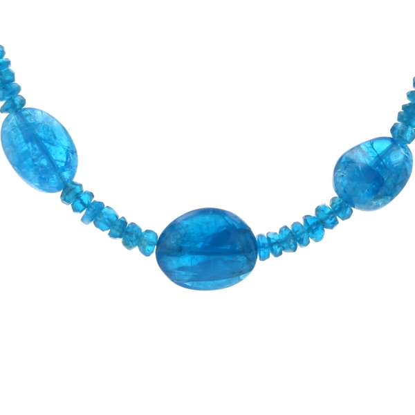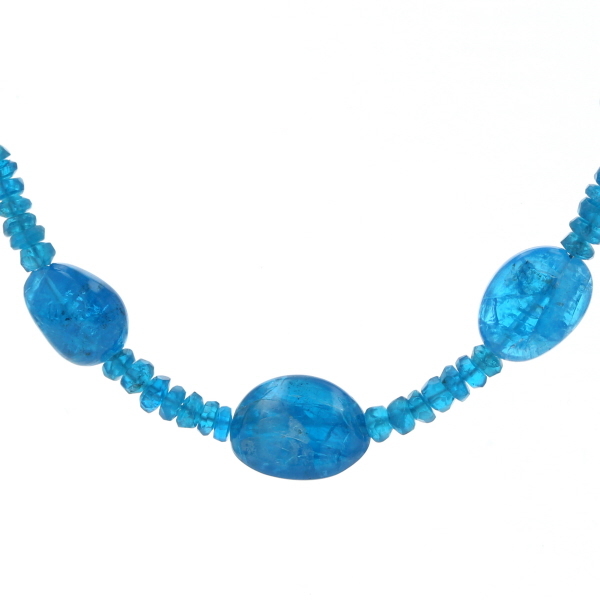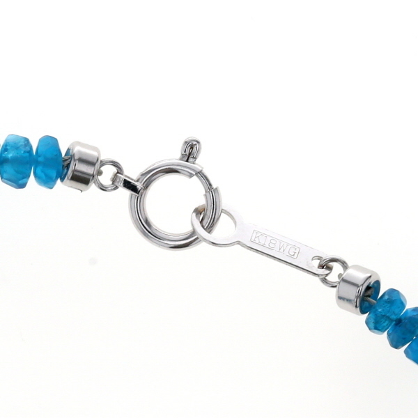 | 商品紹介 | テレビショッピングでお馴染みのGSTVによる、ホワイトゴールドの留め具を使用したブルーアパタイトのネックレスです。 目を引く鮮やかなネオンブルーが魅力的なアパタイトを贅沢に使用したデザインです。 艶やかな光沢を持つ大粒のオーバルやドロップ形状のビーズが配され、その間を小さな多面カットビーズが繋ぐステーションスタイルで仕上げられています。 大粒ビーズの滑らかな質感と、小粒ビーズの繊細なきらめきのコントラストが魅力的です。 爽やかで個性的なブルーカラーが、装いにモダンで洗練された印象を加える一連のネックレスです。 |