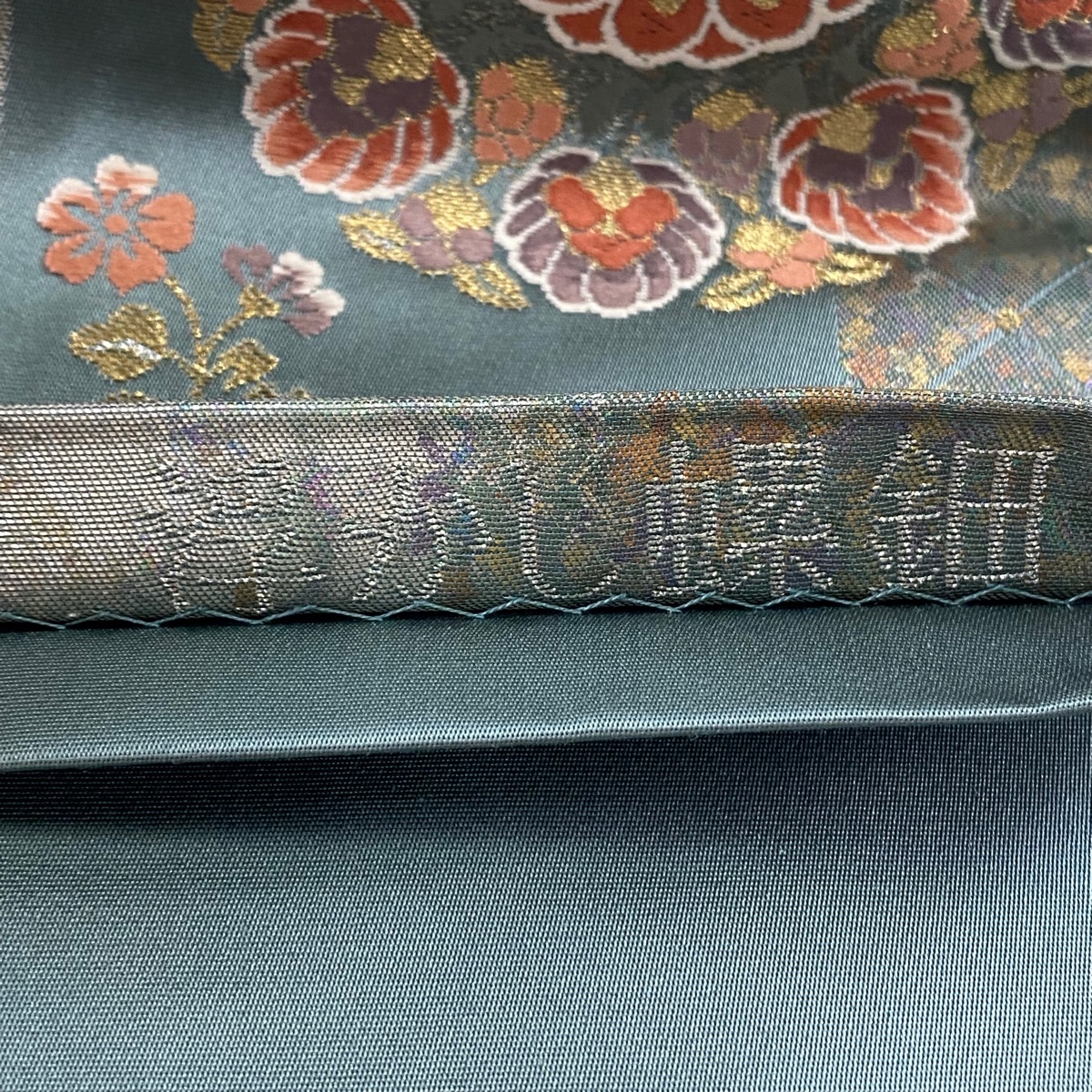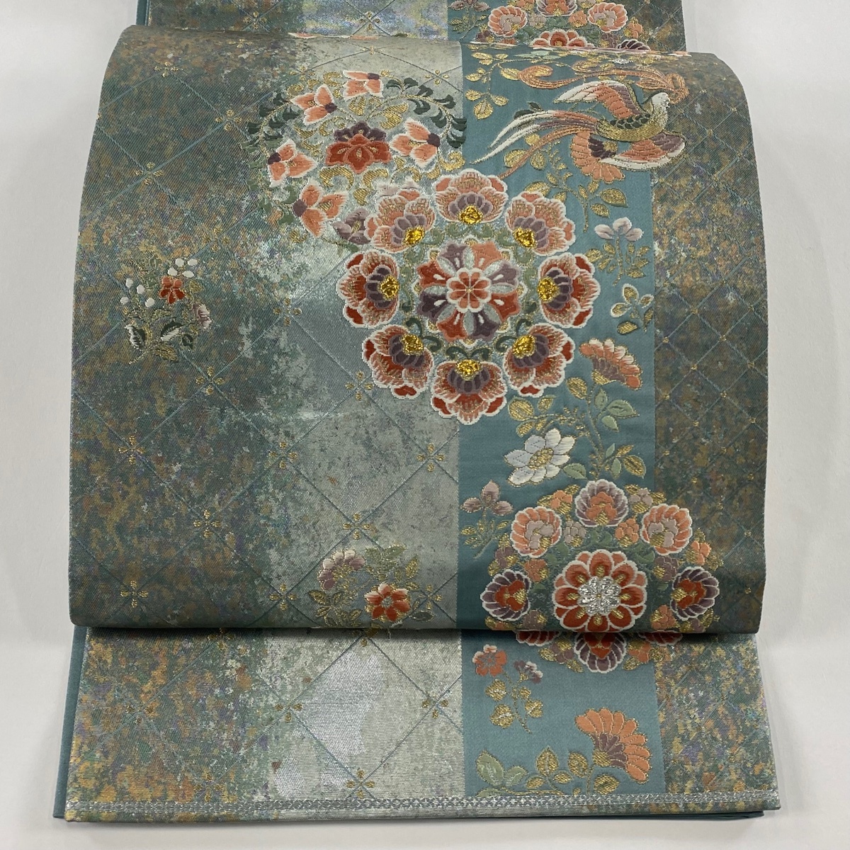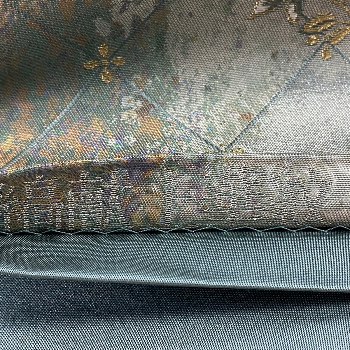 | 袋帯 美品 秀品 関西仕立て 浮かし螺鈿 縞献上華文 金銀糸 箔 灰緑 六通 正絹 【中古】 |
