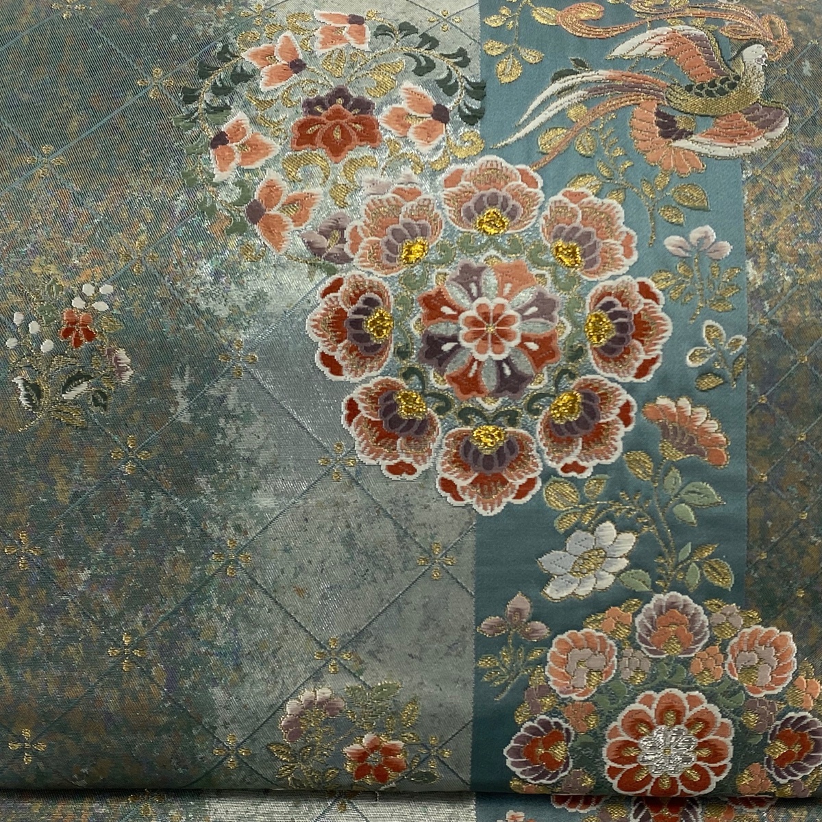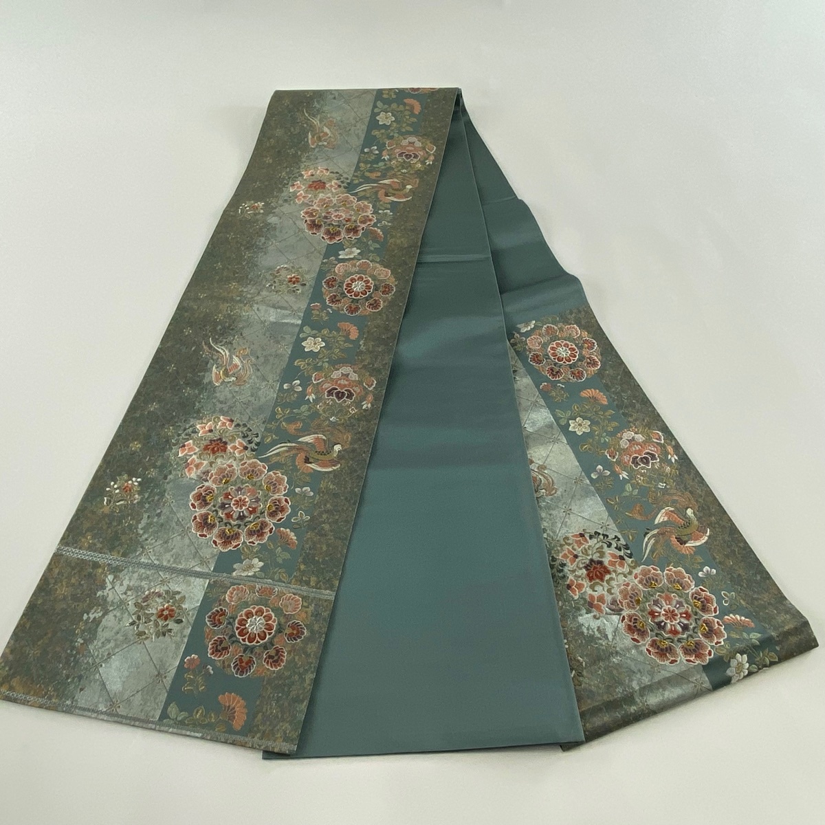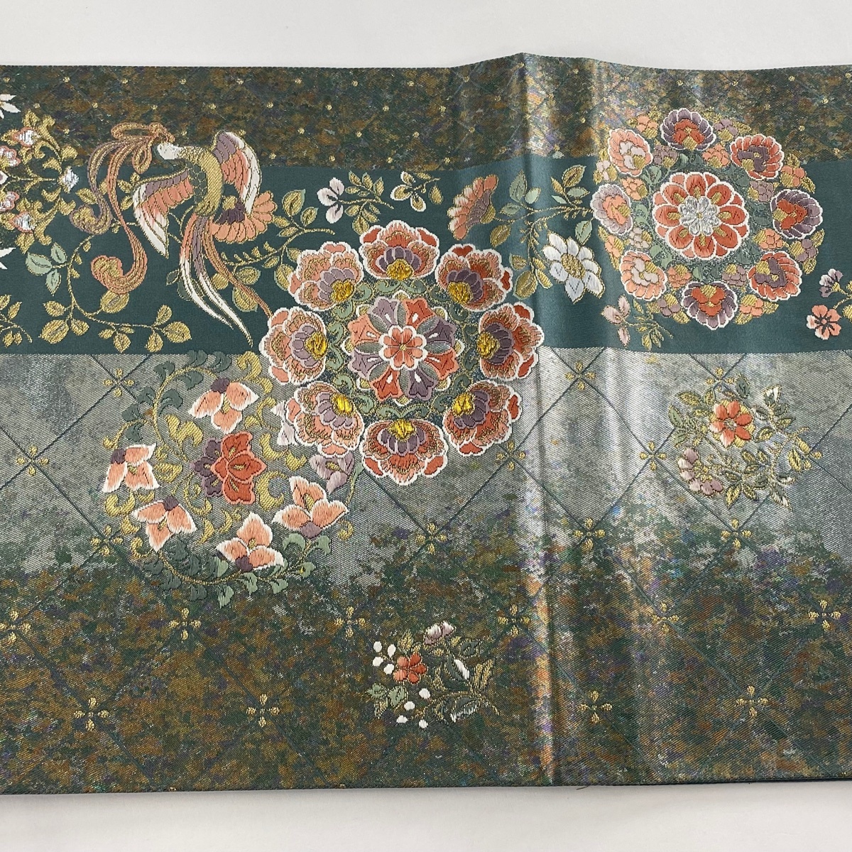 | 袋帯 美品 秀品 関西仕立て 浮かし螺鈿 縞献上華文 金銀糸 箔 灰緑 六通 正絹 【中古】 |