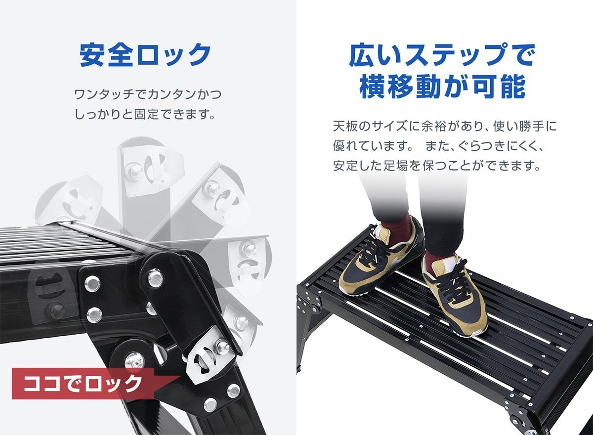 一家に一台あると、超便利! ワンタッチの安全ロック機能付き! 耐荷重150kgの天板で、ぐらつかない安定感! 広いステップで、横移動もラクラク! 天板、ステップ、脚キャップに滑り止め加工を施しているので、 安全に作業ができます。 さらに、天板裏とステップを金具で補強し、高い強度を実現しました。 軽量のアルミ製で、持ち手付きなので、持ち運びもラクラク! コンパクトに折りたたみができ、収納場所にも困りません。 車のトランクルームにスッキリ納まります。 【商品仕様】 カラー :グレージュ サイズ 全体:(約)幅128×奥行45.5×高さ75cm 天板:(約)幅78×奥行30cm 収納時:(約)83×奥行45.5×高さ19.5cm 重量:(約)4.2kg 耐荷重 (約)150kg 材質 本体:アルミニウム 脚キャップ:ABS樹脂 持ち手:プラスチックメッキ ※注意事項 ・海外製品で、簡易梱包での輸入のため風防に擦れや多少の小キズなどがある場合がございますが、商品自体には問題ありませんのでご了承下さい。 ・商品は、モニターによって色合いが異なって見える場合があります。 ・仕様・デザインは改良のため予告なく変更することがあります。 【もちろん新品未使用品です】 商品コード:A19GBE ▼検索キーワード 足場台 アルミ 作業台 踏み台 アルミ足場台 折りたたみ 軽量 足場 踏台 ラダー 軽量 高所作業 掃除 そうじ 雪おろし ガーデニング 作業 洗車 日曜大工 避難 人気 おすすめ |