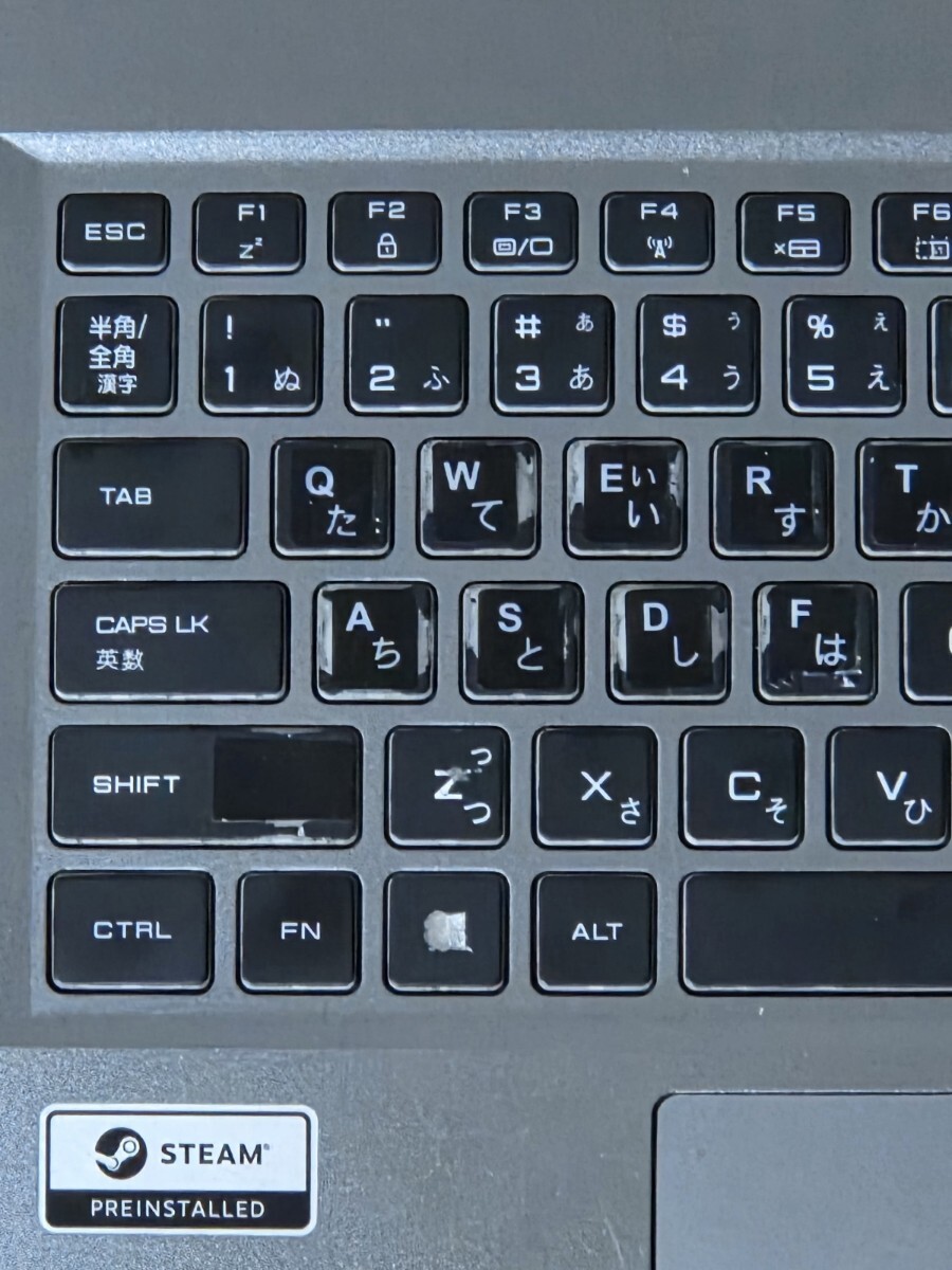 目立つ傷みは入手時からキートップのプリントが剥げている箇所が19ありますが、Windowsキー以外は上からシールが貼られています。